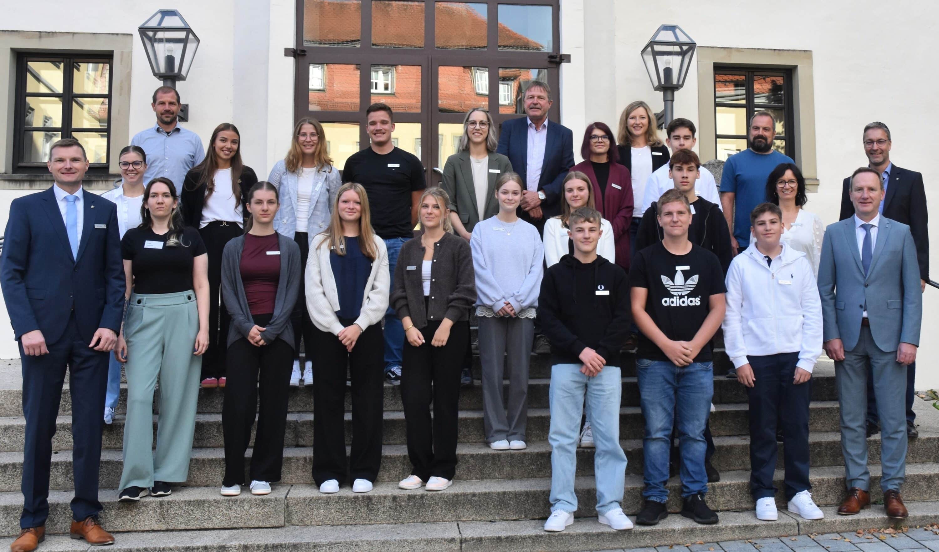 Titelbild: 13 neue Auszubildende starteten am 1. September bzw. am 1. Oktober ihre Ausbildung beim Landkreis Haßberge bzw. Zweckverband Schulzentrum. Unser Foto zeigt die Nachwuchskräfte zusammen mit stellvertretendem Landrat Michael Ziegler, Geschäftsleiter Marcus Fröhlich, Ausbildungsleiterin Angelika Berthold, Ausbilder Florian Kraft (stv. Leiter IT-Abteilung), Alfons Schanz (Leiter Tiefbauverwaltung), Johannes Bayer (stv. Leiter Gartenbau- und Landespflege), Sylvia Büttner (Leiterin BIZ) und Melanie Pietsch (Ausbilderin BIZ); Ralf Mühlfriedel (Vertreter Personalrat) sowie Tamara Klopf, Giulia Jäger und Noah Pfeiffer von der Jugend- und Auszubildendenvertretung.
