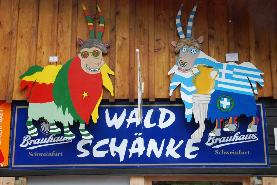 Genau genommen sind es sogar 32 Gründe: Aus Holz gefertigte und in den Länderfarben bemalte Walliser Ziegen, die mehrere 7. und 8. Klassen der Albert-Schweitzer-Volksschule sehr individuell gestalteten. Ab sofort hängen sie im Park, wo auch das Schild eines neuen Hauptsponsors das Hauptgebäude mit der Waldschänke ziert.