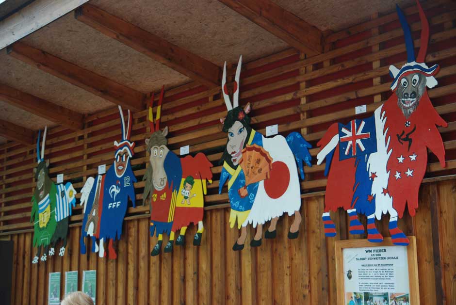 Vor vier Jahren waren die (natürlich andere) Schüler schon mal aktiv und fertigten 32 Elche zur Weltmeisterschaft in Deutschland an, die nach der WM dann meistbietend versteigert wurden. Was mit den Ziegen später passieren wird, weiß der umtriebige Wildpark-Macher Thomas Leier zwar noch nicht so genau. Es sollen aber schon wieder zahlreiche Anfragen vorliegen. Vor allem für die schönsten der hölzernen Tiere, die unter der Leitung des Fachlehrers Ingo Schäfer entstanden. Die japanische Ziege zeigt beispielsweise eine Geisha, die französische einen Eifelturm, die südafrikanische einen Elefanten am Hinterteil, während die USA-Ziege eine coole Brille trägt. „Typische Motive aus der Fußballszene oder Symbole der einzelnen Länder“ gab Schäfer bei der Umsetzung vor. Zudem mussten die Schülerinnen und Schüler sich mit den 32 Ländern befassen, recherchieren, jeweils ein Kurzreferat halten. So entstanden die individuellen Maskottchen – verbunden mit viel Wissen über teils recht exotische Ecken der Welt. Von Honduras beispielsweise dürften die wenigsten Schüler vorher etwas gehört, über Nordkorea wohl wenig bis nichts gewusst haben.