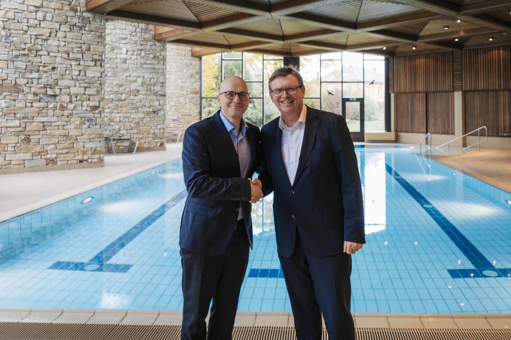 Titelbild: Oberbürgermeister Dr. Dirk Vogel und Stephan Greb, Vorstand der Unternehmensgruppe HESCURO, präsentierten die neuen Schwimmmöglichkeit für die Herbst- und Wintermonate in Bad Kissingen im Hallenbad der HESCURO KLINIK Bad Kissingen.