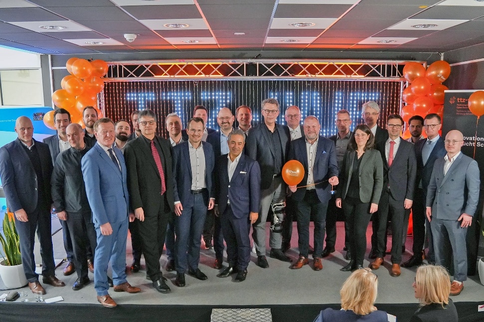 Titelbild: Von links: Hochschulpräsident Prof. Dr. Jean Meyer, Staatsminister Markus Blume, Thomas Eberth, Landrat des Landkreises Würzburg, sowie Prof. Dr. Sebastian Biedermann, Leiter des TTZ-WUE, drücken den Buzzer zur offiziellen Einweihung des TTZ-WUE (Foto: THWS/Tobias Hestner)