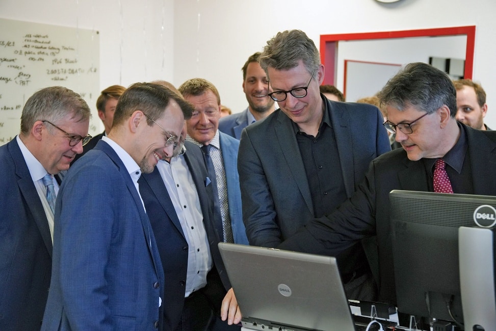 Wie „Deutschlands gefährlichster Schreibtisch“ aussehen kann, erfuhr StM Markus Blume (2. v. re.), indem er potenzielle Gefahrenquellen an Hardware des TTZ-WUE selbst ausprobierte (Foto: THWS/Tobias Hestner)