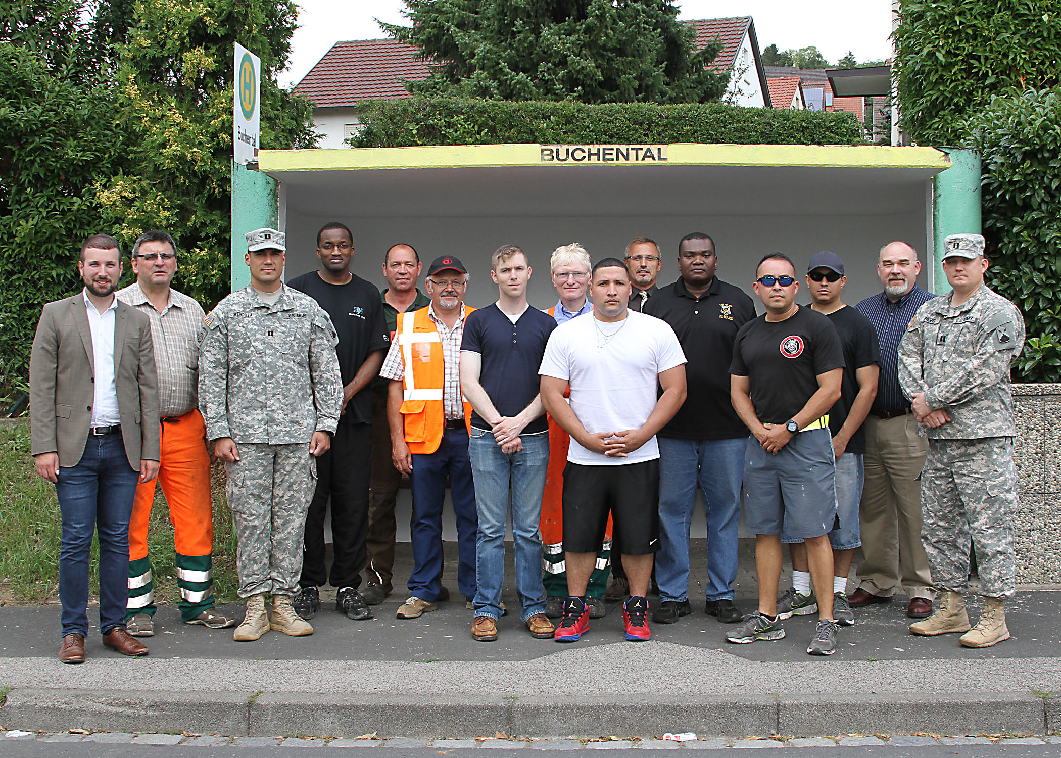 Das Foto zeigt von links Bürgermeister Stefan Rottmann, Dieter Hümpfer, Captain Erick Mendoza, Staff Sergeant Douglas Brown, Georg Räth, Alfons Brahmann, Sergeant James Mitchell, Gregor Wohlfahrt, Sergeant Irving Newberry, Garnisons Verwaltungsdirektor Klaus Mauder, Staff Sergeant William Marks, Sergeant FirstclassPeter Rentas, Sergeant Brian Tirado, Garnisons-Manager Brian Adkins und Captain Kevin Silvis.
