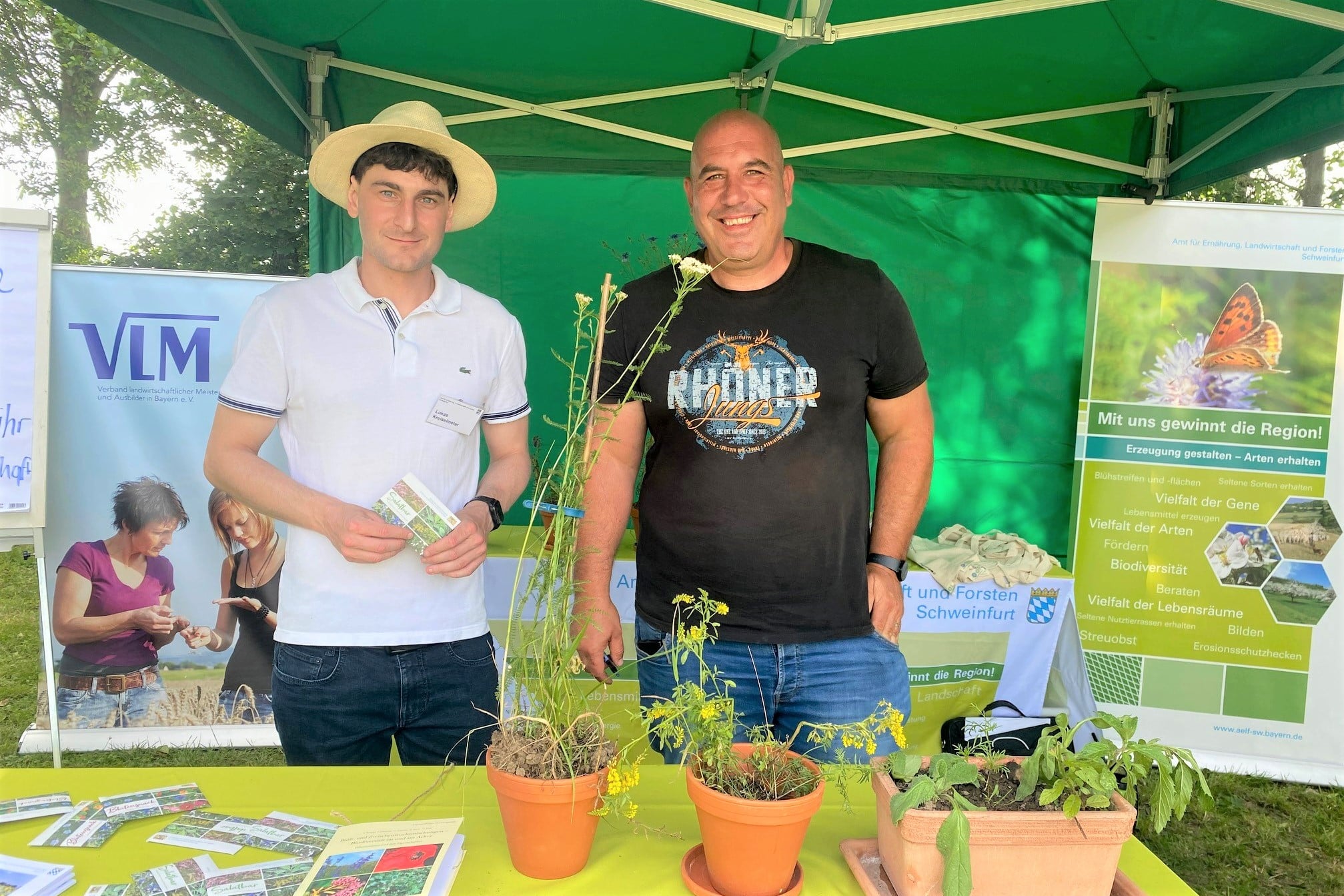 Joachim Weber (li), Leiter der Abteilung „Bildung und Beratung“ am AELF Schweinfurt mit Referendar Lukas Kreiselmeier am Stand auf dem Bauernmarkt