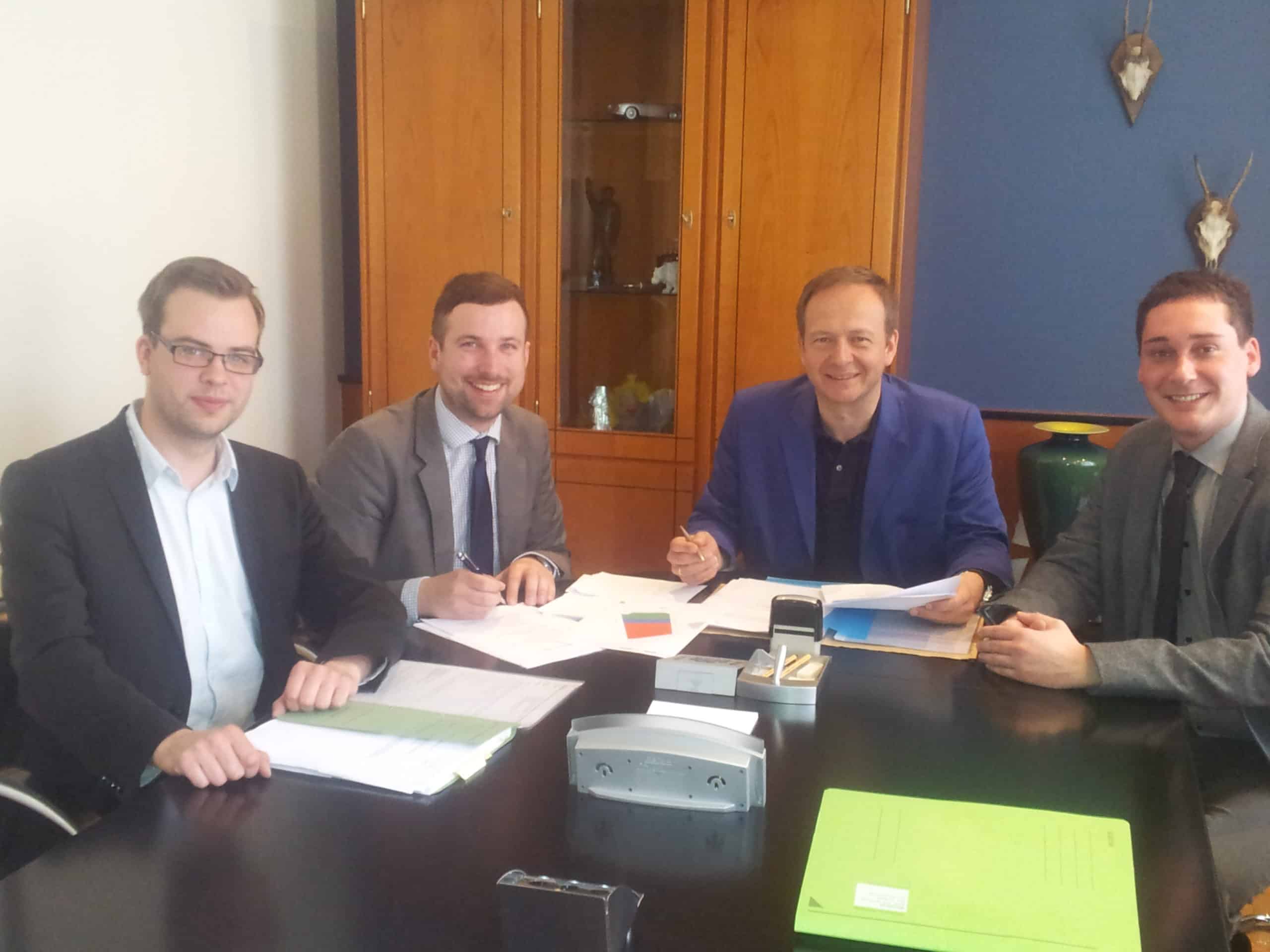 Das Foto zeigt von links: Verwaltungsfachwirt Markus Werb, Bürgermeister Stefan Rottmann, Notar Dr. Bernd Weiß, sowie Thomas Leßmann (BayWa).
