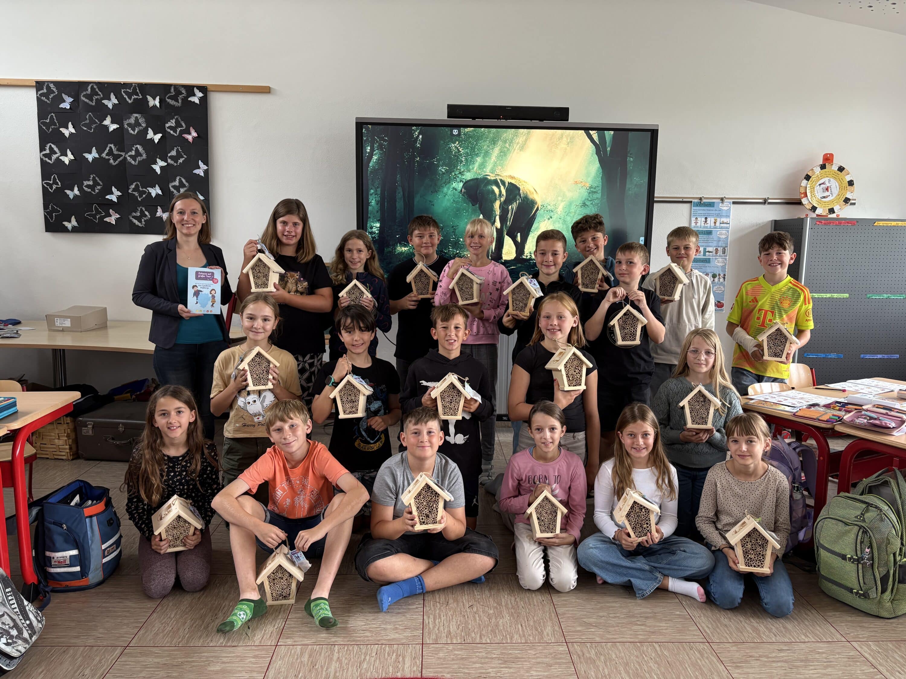 Titelbild: Die Schülerinnen und Schüler der vierten Klasse der Grundschule in Dampfach freuten sich über Wildbienenhotels und Blumenkugeln, die Regionalmanagerin Sonja Gerstenkorn (hintere Reihe links) als Belohnung für die gelösten Aufgaben aus dem Landkreisbuch überbrachte.