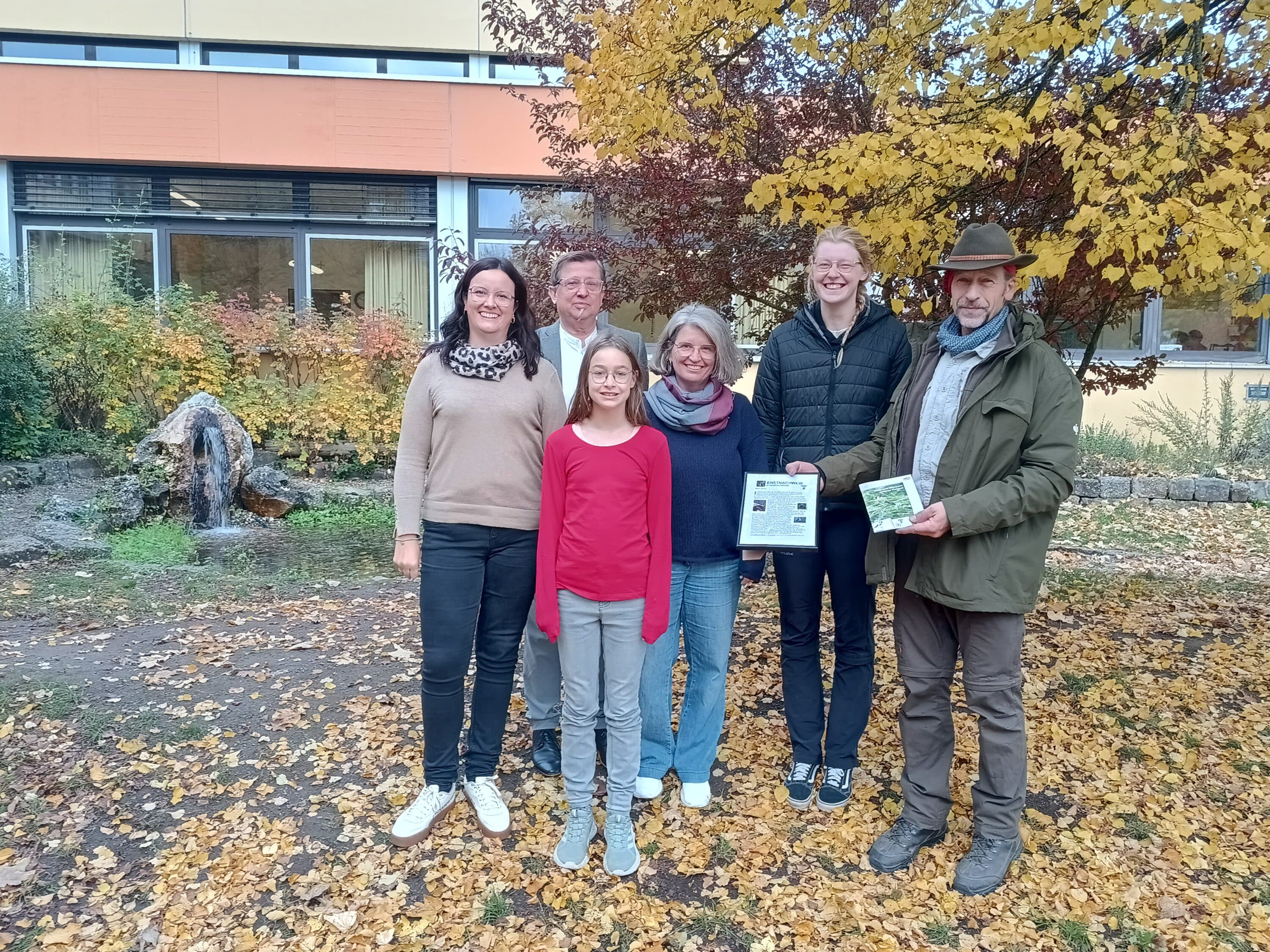 Voller Freude wurde der Entdeckerin Cilia der Erstnachweis zum Fund der Gottesanbeterin vom Naturparkranger Arno Ludwig übergeben. Auf dem Bild zu sehen (von links): Juliane Klopf (Kooperationslehrkraft Naturparkschule), Heribert Jäger (Rektor), Cilia (Entdeckerin), Sabine Schimmer (Klassenleiterin), Lisa Flachsenberger (FÖJlerin des Naturparkes), Arno Ludwig (Naturparkranger). Fotografin Nina Eiring