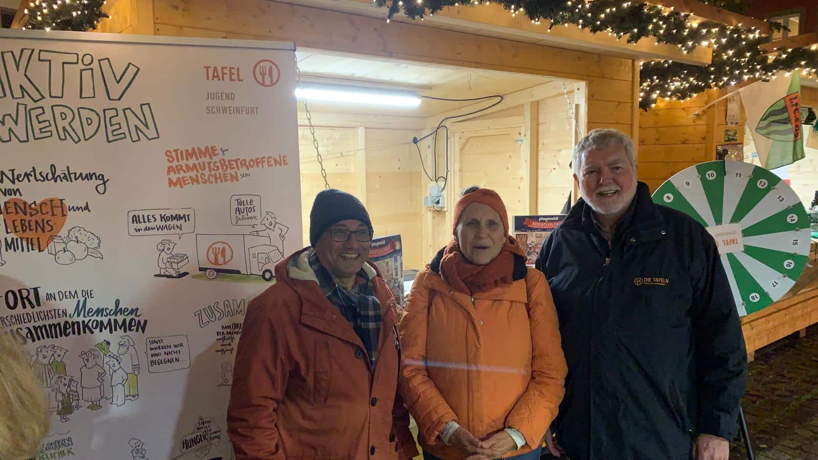 Schweinfurt: Alle Jahre wieder besetzen die Ehrenamtlichen der Tafel Schweinfurt zwei Tage lang den Herzensstand am Schweinfurter Weihnachtsmarkt. Bei Weihnachtsglitzer und Lebkuchenduft konnten sich die Kinder am Glücksrad austoben und kleine Leckereien gewinnen. Entsprechend war der Andrang groß. Die ehrenamtlichen Helferinnen und Helfer der Tafel informierten über ihre Arbeit. Gleichzeitig konnten die Besucher von den Möglichkeiten erfahren, wie man die Tafel unterstützen kann.