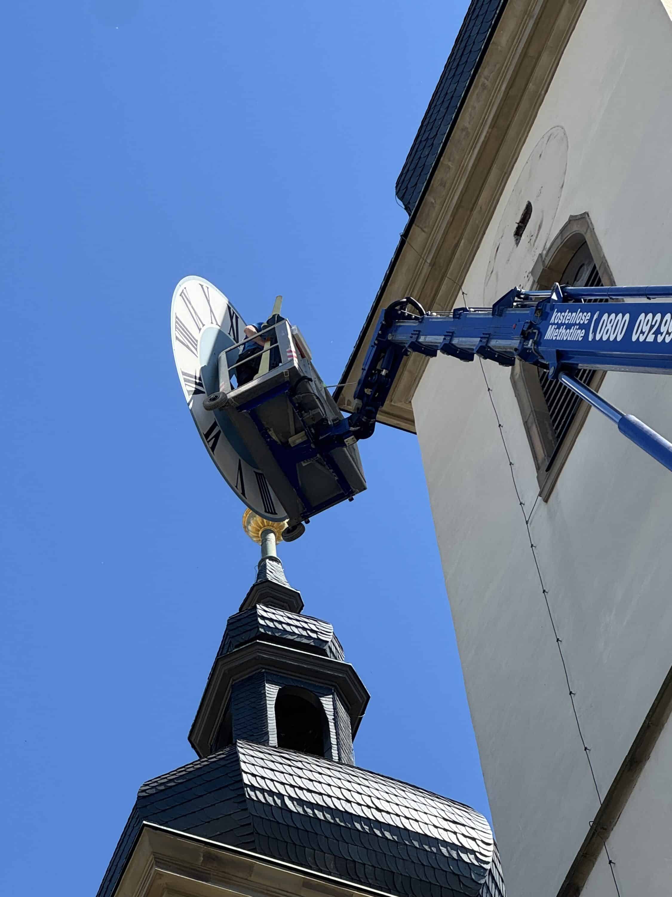 Grafenrheinfeld: Die Zifferblätter der Kirchturmuhr unserer Pfarrkirche Kreuzauffindung werden umfassend restauriert. Kürzlich wurden die drei Zifferblätter mit einem Durchmesser von jeweils 2,50 Metern mithilfe einer Spezialarbeitsbühne in rund 40 Metern Höhe abgebaut.