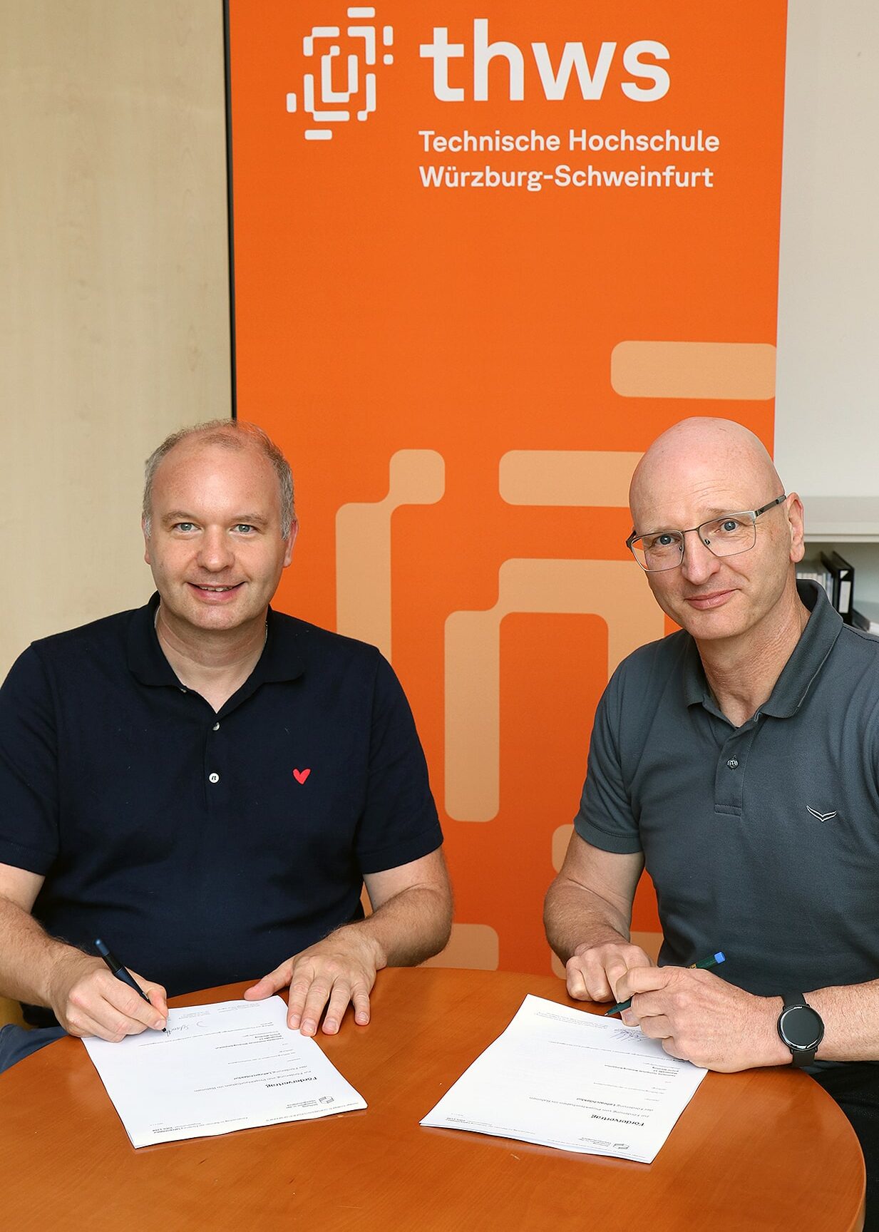 Titelbild: Prof. Dr. Jan Schmitt (li.), Vizepräsident für Gründung und Forschung an der THWS, und Prof. Dr. Oliver Bletz-Siebert von der Fakultät Angewandte Natur- und Geisteswissenschaften unterschreiben die Förderverträge (Foto: THWS/Eva Kaupp)