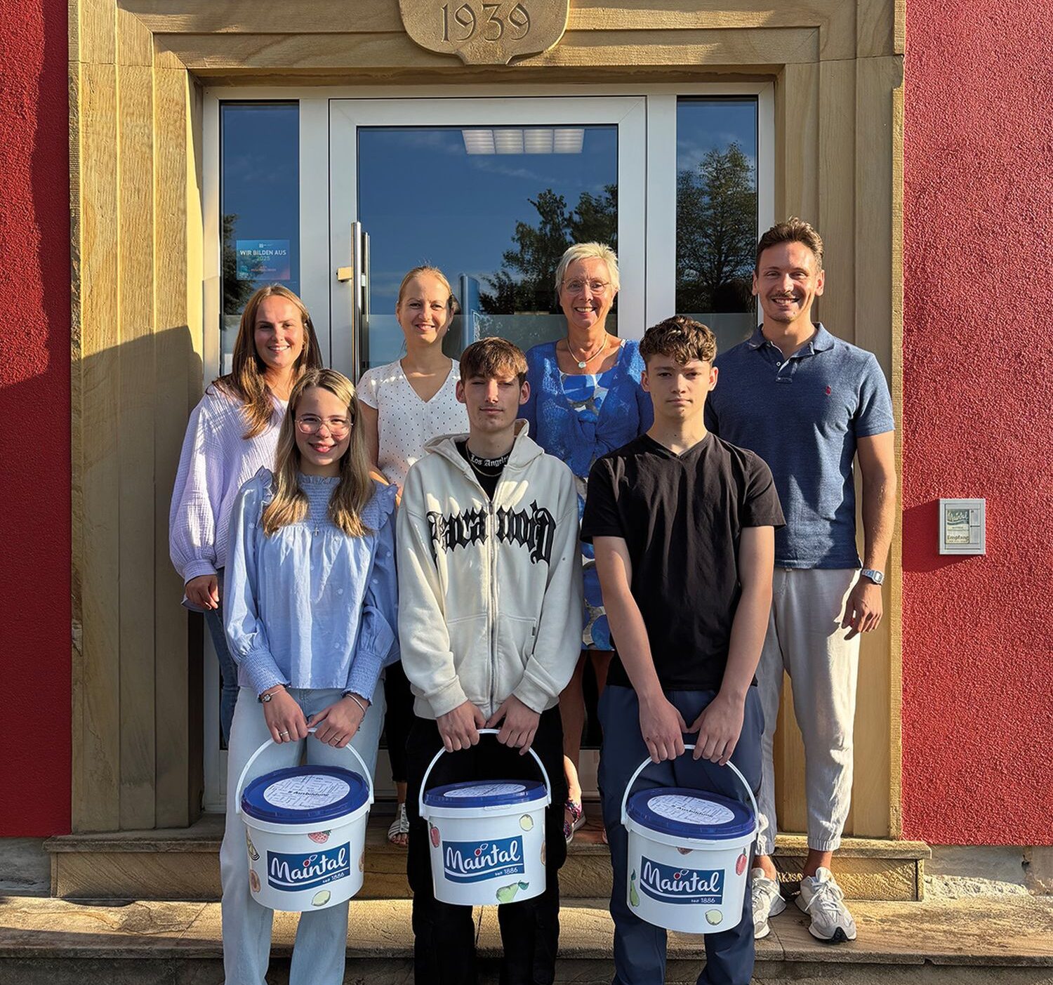 [Hinten v.l.n.r.] Ausbilderin Anna-Lena Zimmermann, Personalreferentin Petra Endres, Geschäftsführerin Anne Feulner sowie Valentin Feulner (Familiennachfolge, 5. Generation) begrüßen die drei neuen Maintal Auszubildenden [Vorne v.l.n.r.] Katharina Raab, Cem Kartal und Leonard Mücke.