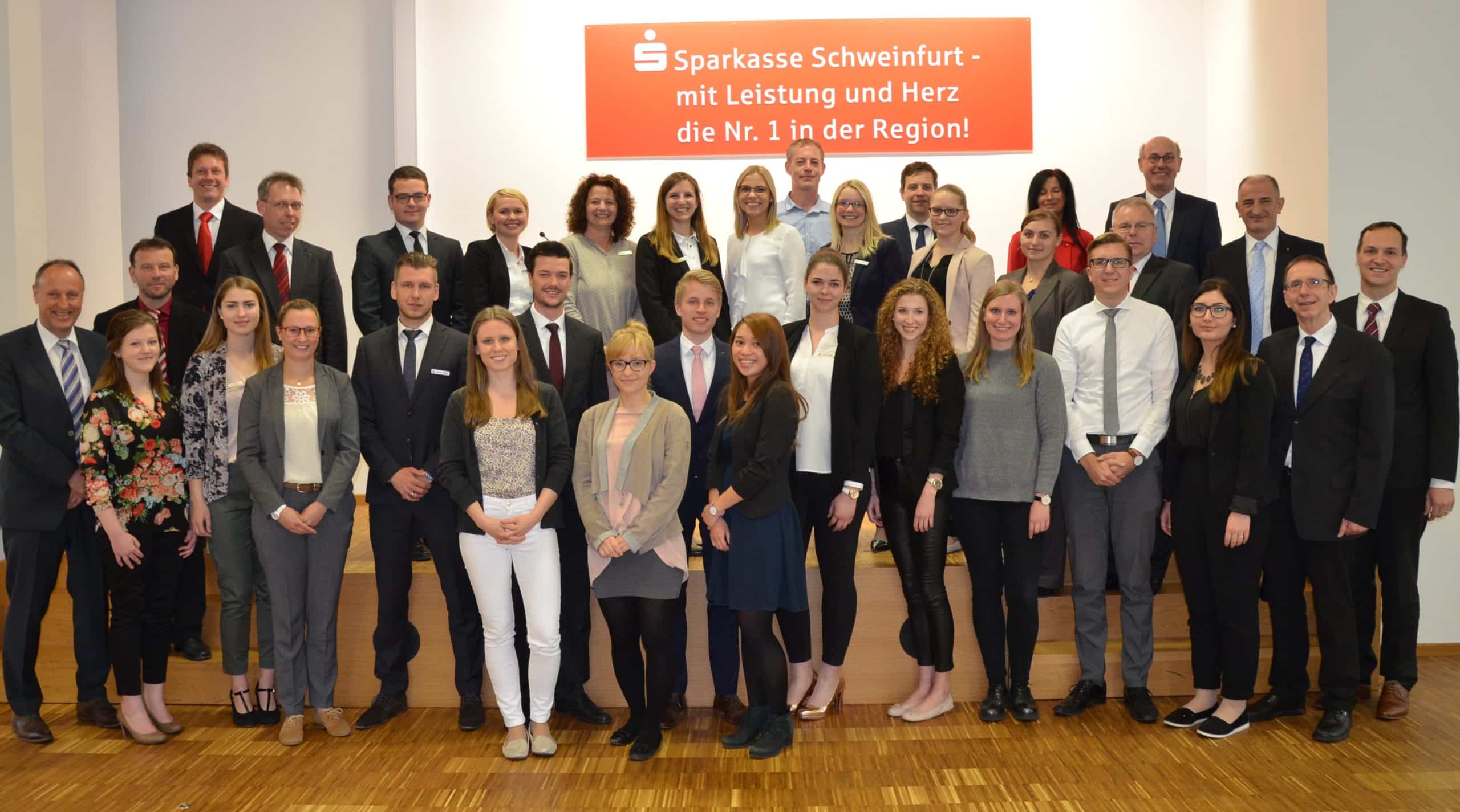 Das Foto (©Hubert Matusik/Sparkasse Schweinfurt) zeigt in der oberen Reihe von links: Oberstudienrat Andreas König, Tobias Hofmann, Oberstudienrat Michael Reuß, Fabian Zinser, Lilia Miske, Ausbildungsleiterin Stefanie Philipp, Carina Hippeli, Saskia Puchner, Sascha Mönch, Nadine Schemmel, Louis Keßler, Marcella Dotzel, Carina Hofmann, Luitgart Wegner, Georg Voit, Vorstandsvorsitzender Johannes Rieger, Vorstandsmitglied Roberto Nernosi