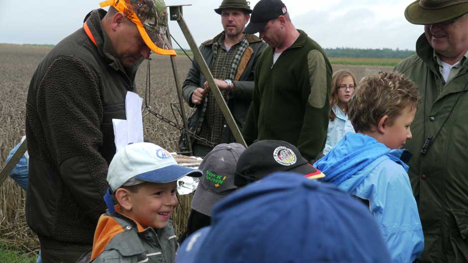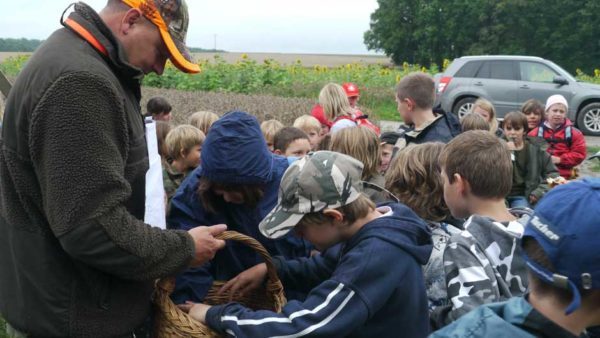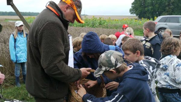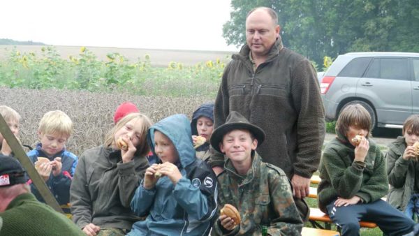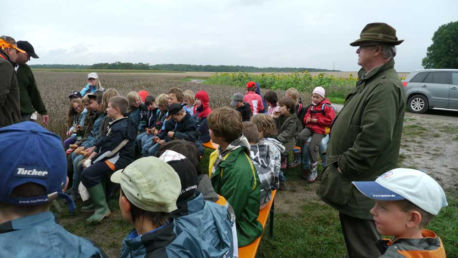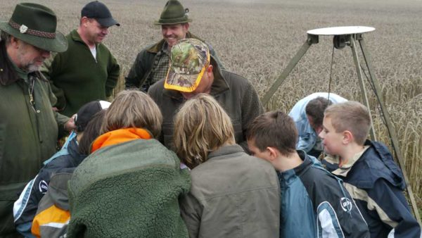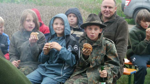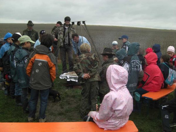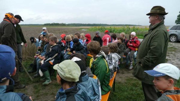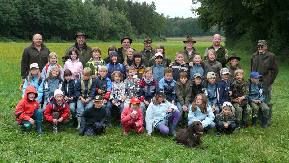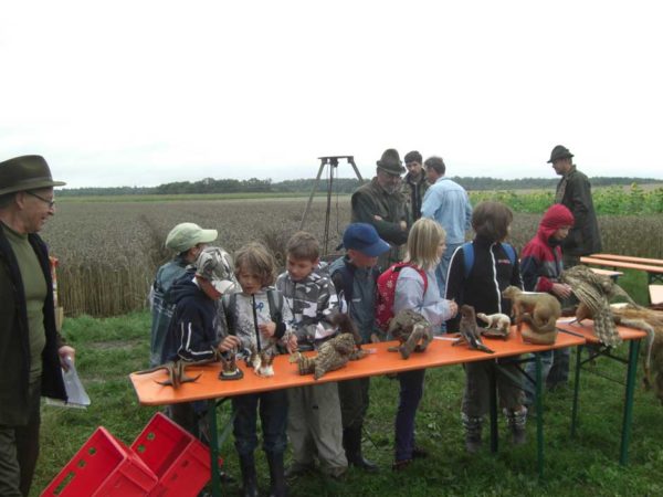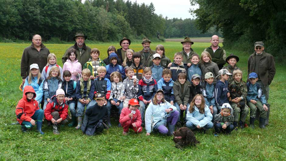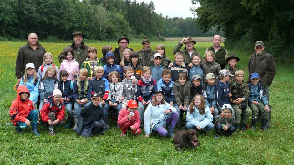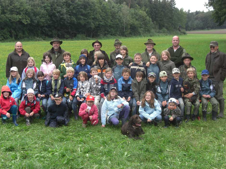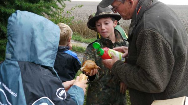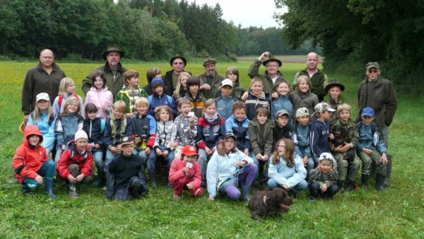Auch in diesem Jahr machten Revierpächter Michael Noppinger und seine Helfer eine interessante Ferienspaßaktion möglich. Die in Gruppen aufgeteilten Kinder versuchten sich mit Eifer im Erraten von Baumarten, Getreidearten und Tiere des Waldes und des Feldes. Die Jagdhunde „Cicco“ und Dackel „Stella“ begleiteten die Gruppen durch den Wald.