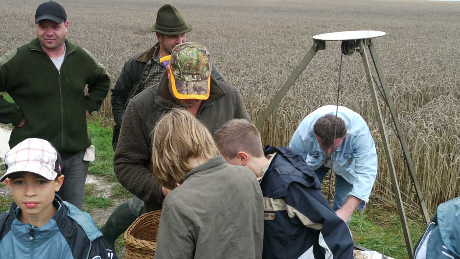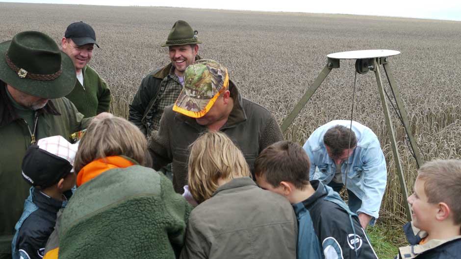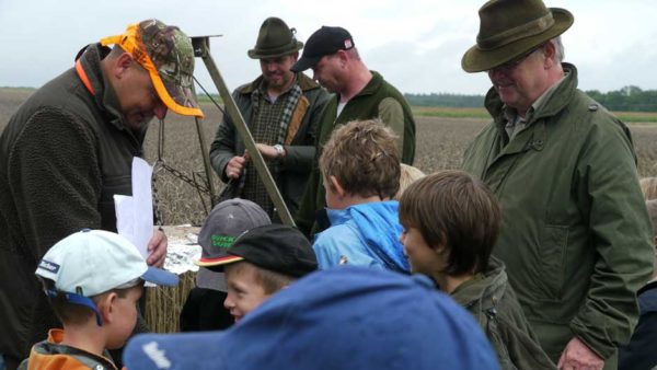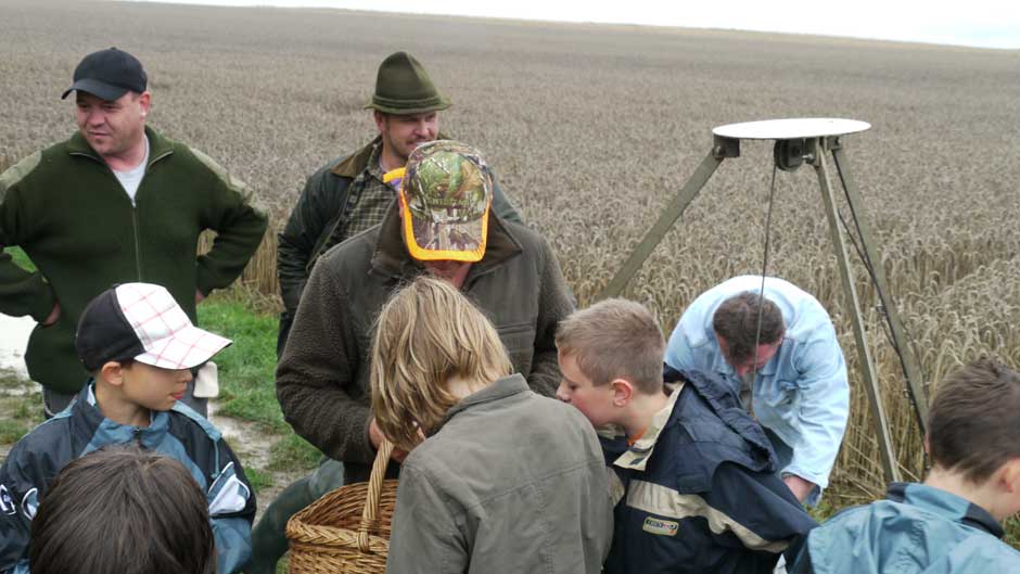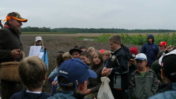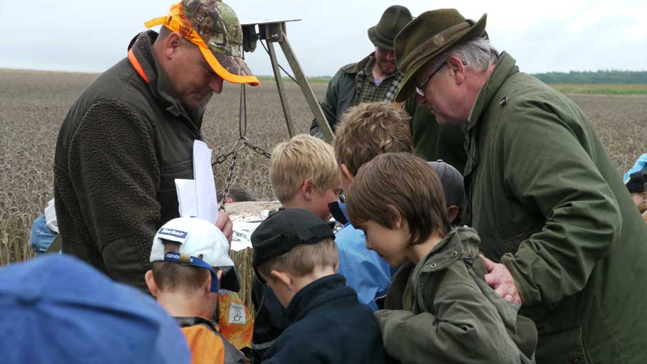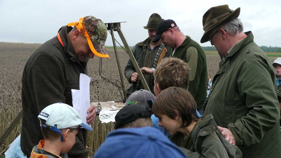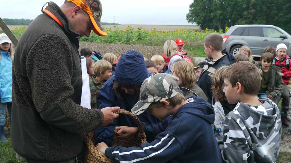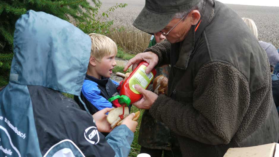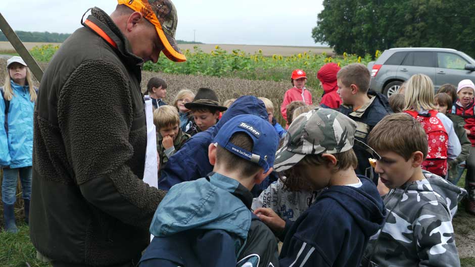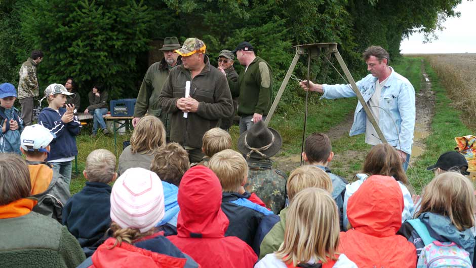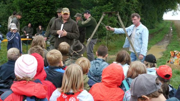 Auch in diesem Jahr machten Revierpächter Michael Noppinger und seine Helfer eine interessante Ferienspaßaktion möglich. Die in Gruppen aufgeteilten Kinder versuchten sich mit Eifer im Erraten von Baumarten, Getreidearten und Tiere des Waldes und des Feldes. Die Jagdhunde „Cicco“ und Dackel „Stella“ begleiteten die Gruppen durch den Wald.
