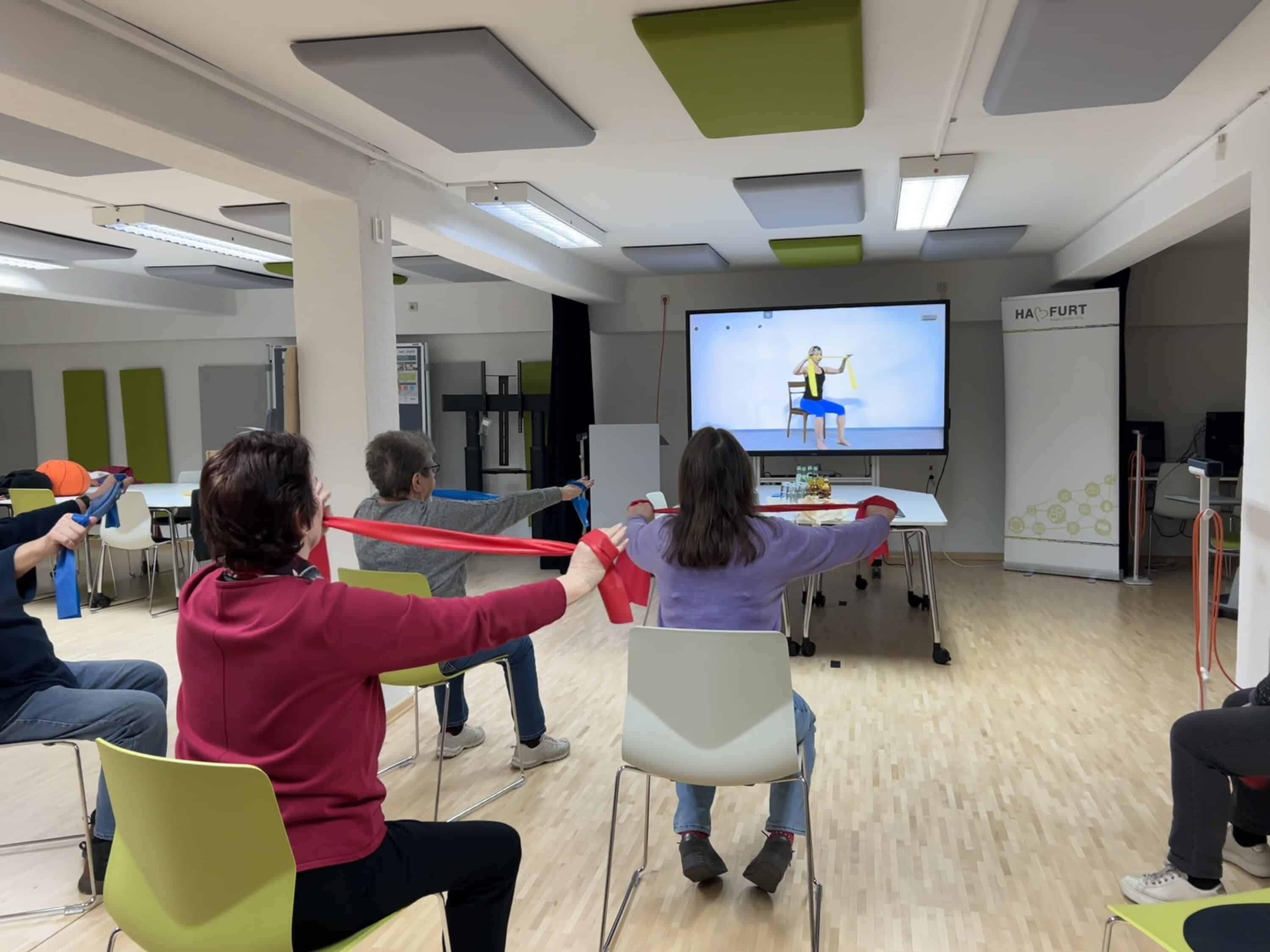 Titelfoto: Beim vergangenen Termin wartete auf die Teilnehmenden ein sanftes Workout im Sitzen mit dem Theraband, angeleitet durch ein Online-Video im Stadtlabor Haßfurt (Fotoquelle: Friederike Schulz/MGH)