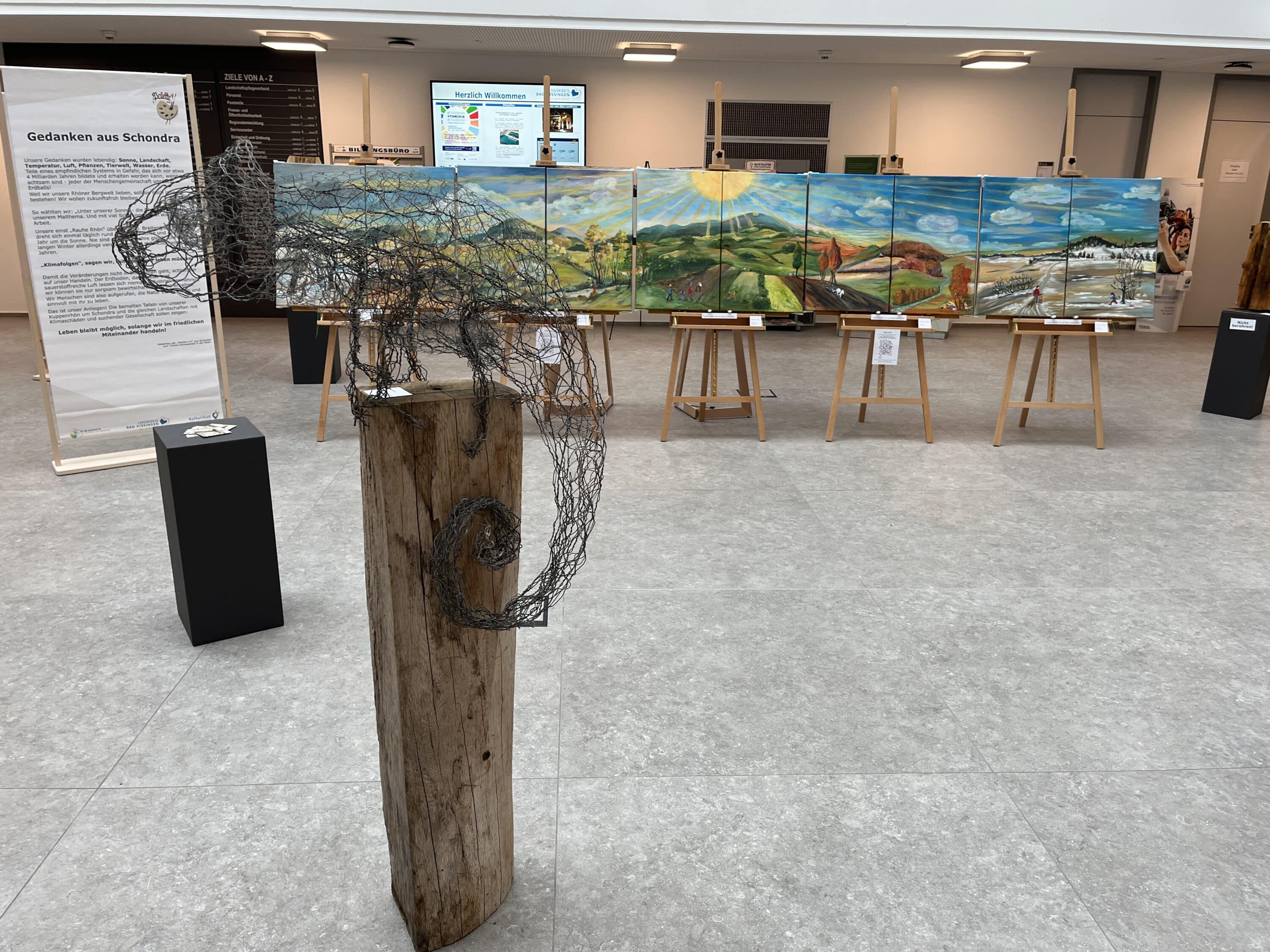 Während wissenschaftliche Klimaszenarien oft eine sachlich-nüchterne Ansammlung von Zahlen sind, besitzen Künstlerinnen und Künstler die Fähigkeit, diese Daten in eine greifbare Bildsprache zu übersetzen. Im Rahmen des Projekts „Kultur.vermittelt.Klima“ haben sich Mitglieder des Malvereins „Palette e.V.“ aus Schondra sowie die Holzbildhauerinnen Dr. Annette Scheder und Eva Reichert-Nelkenstock intensiv mit dem Thema auseinandergesetzt.