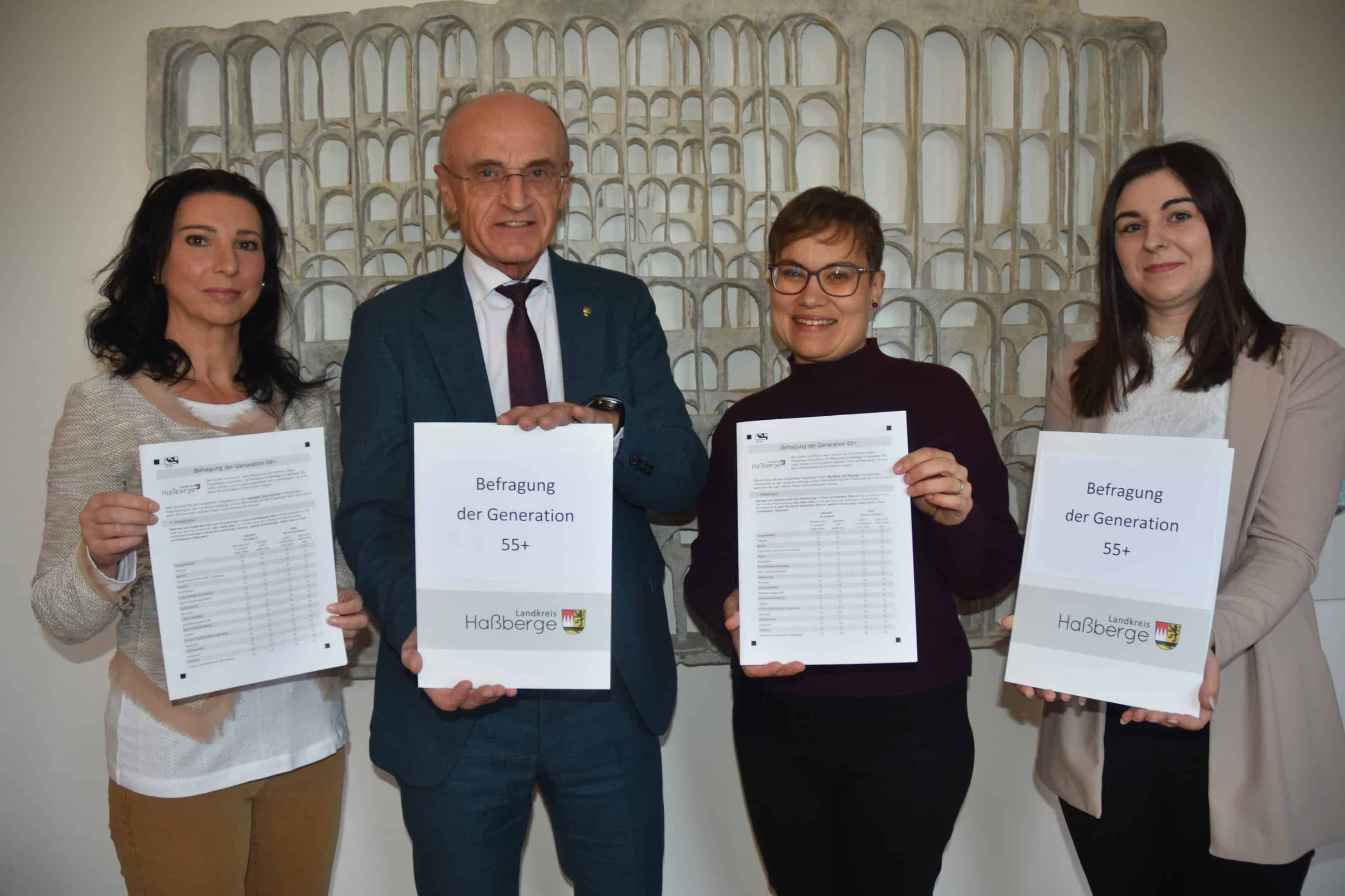Titelbild: Der Landkreis Haßberge entwickelt sein seniorenpolitisches Gesamtkonzept zusammen mit dem sozialwissenschaftlichen Forschungsinstitut BASIS weiter. Um ein möglichst genaues Bild der Lebenssituation älterer Menschen im Landkreis zu erhalten, werden Bürgerinnen und Bürger ab 55 Jahre angeschrieben. Landrat Wilhelm Schneider, Melinda Dorosch, Natalie Harfst und Carina Berger hoffen, dass sich viele der angeschriebenen Personen an der Umfrage beteiligen. Foto: Moni Göhr/Landratsamt Haßberge