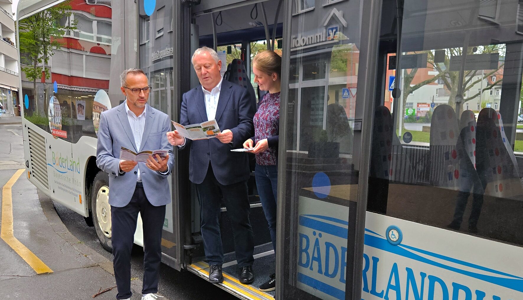 Titelbild::Landrat Thomas Bold (Mitte) mit Jürgen Metz (Abteilungsleiter Kreisangelegenheiten) und Nora Schwetje (Kreisentwicklung und ÖPNV) am Bäderlandbus, einem von vier Linien der Freizeitbuslinie des Landkreises.
