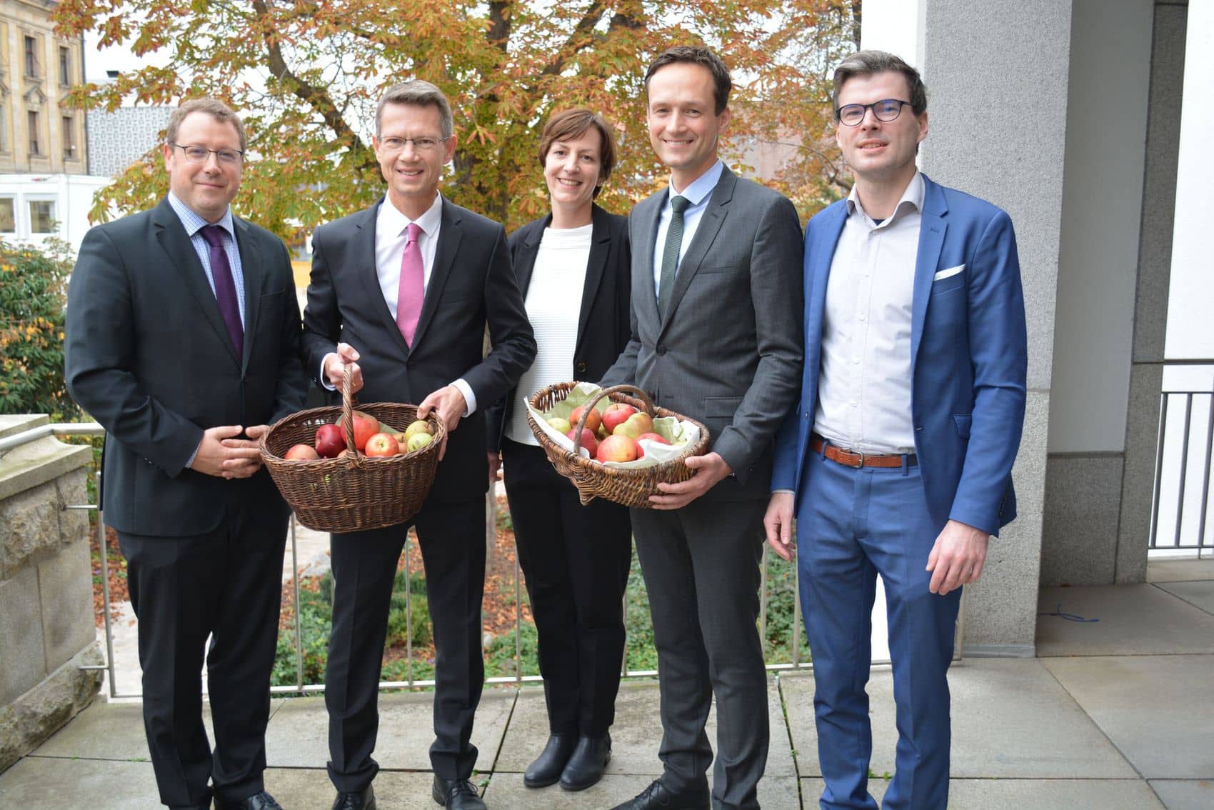 1) v.l.: Gunnar Geuter vom Bayerischen Landesamt für Gesundheit und Lebensmittelsicherheit (LGL), Oberbürgermeister Sebastian Remelé, die Leiterin der Geschäftsstelle der Gesundheitsregionplus Anja Lehmeyer, Landrat Florian Töpper und Dr. Till Beiwinkel (ebenfalls LGL).