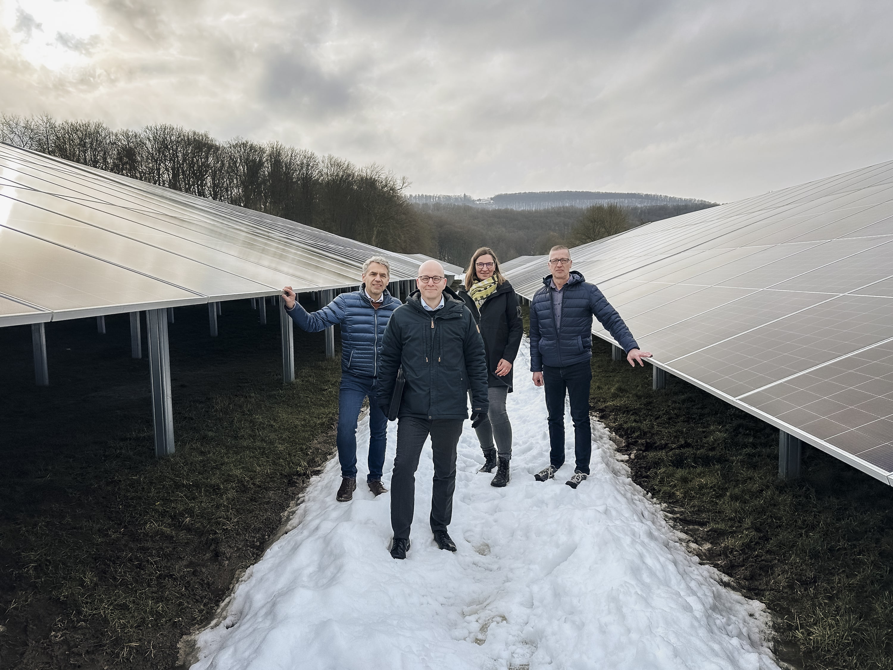 Foto: Eine PV-Anlage enormen Ausmaßes entsteht derzeit an der Bad Kissinger Kläranlage: Oberbürgermeister Dr. Dirk Vogel nahm sie mit seinem Team (von links) Thomas Hornung, Leiter Tiefbau, Christine Schwind, Leiterin Bauamt, und Ivo Straube, Leiter Kläranlage, in Augenschein.