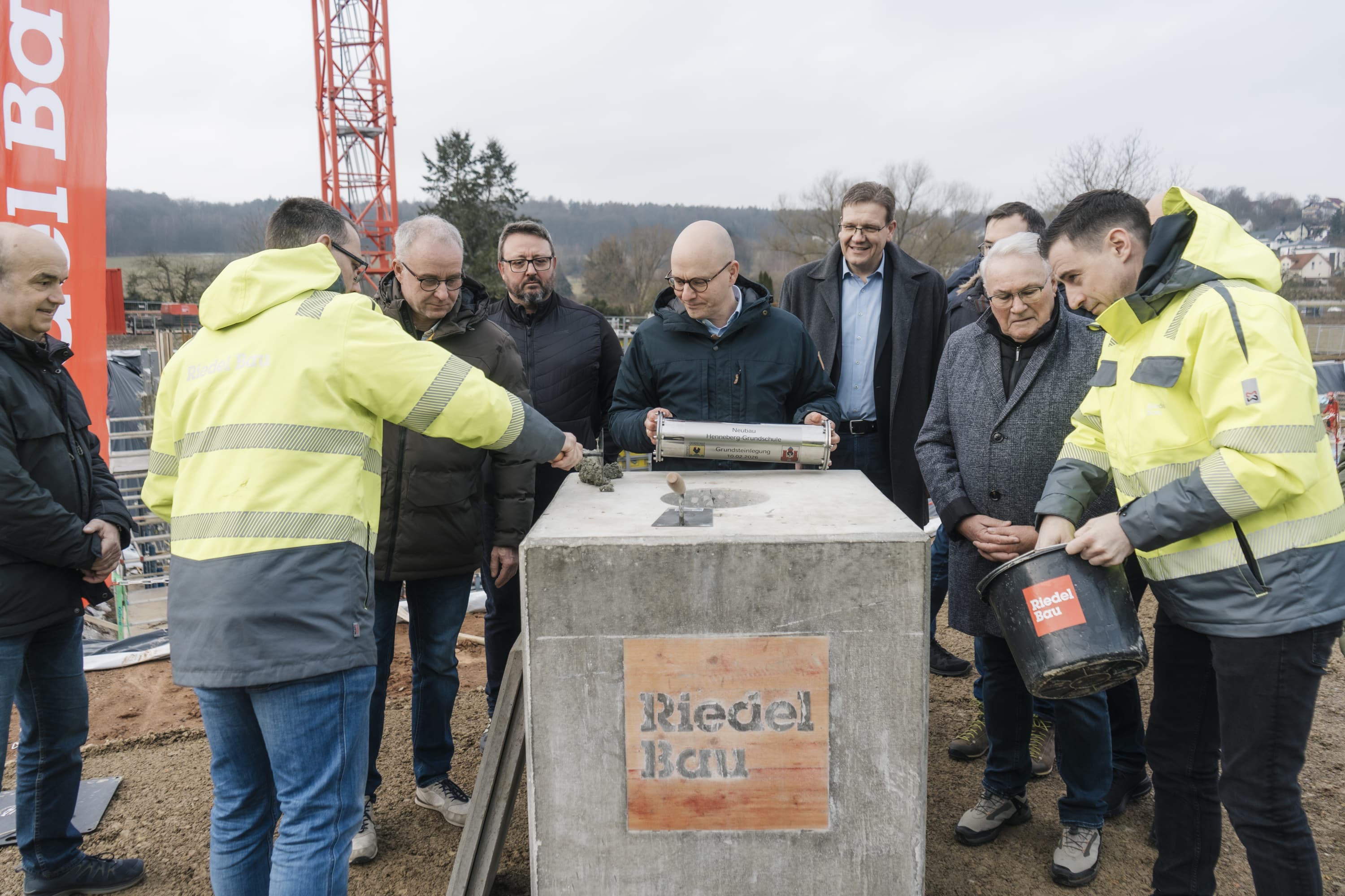 Bild: Oberbürgermeister Dr. Dirk Vogel (Mitte) versenkte bei der Grundsteinlegung begleitet von Stadträten, Bürgermeister Thomas Leiner (Zweiter von rechts) und Vertretern der Baufirma Riedel Bau eine Zeitkapsel in einen Betonblock.