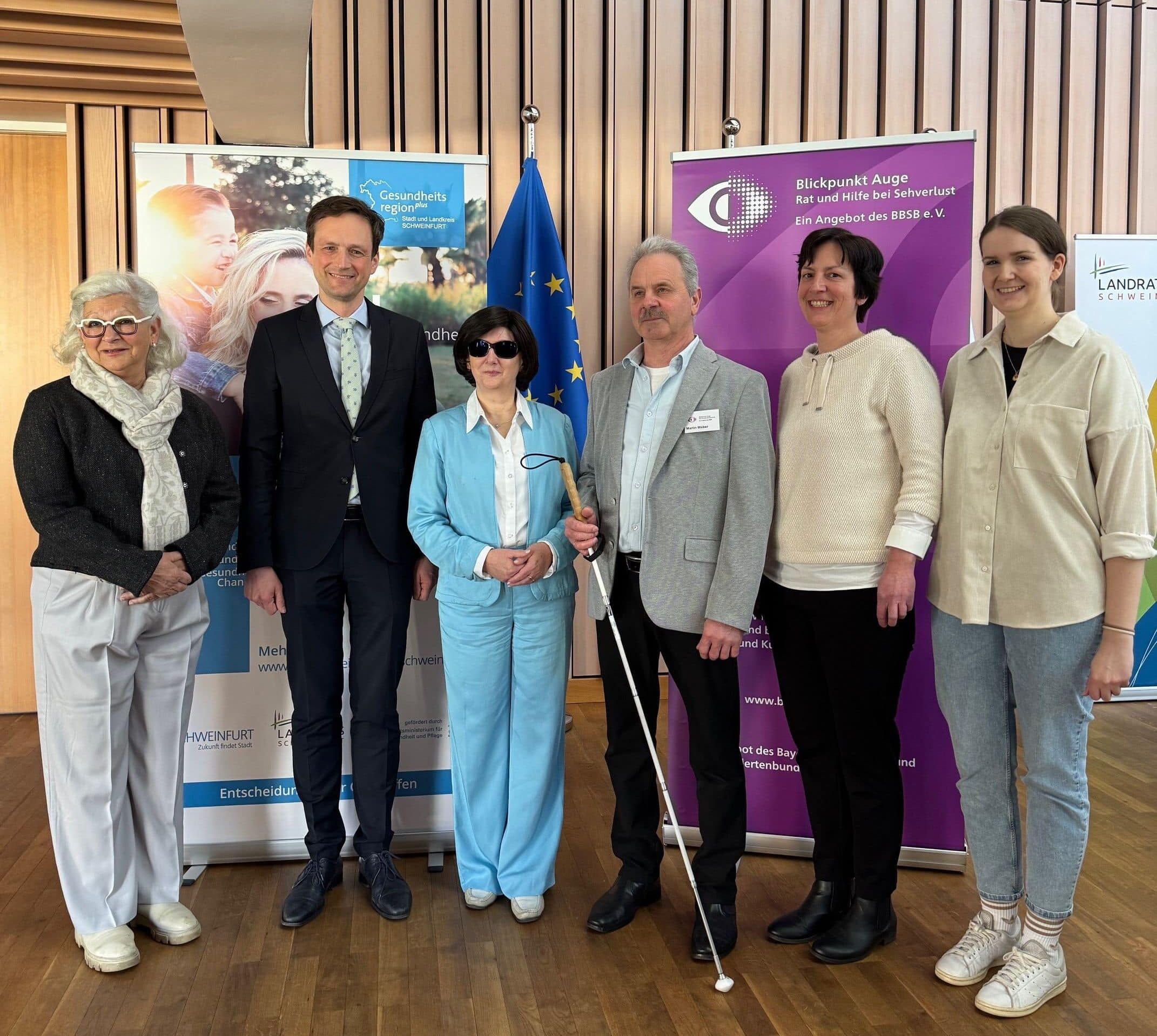 Bild: Über eine gelungene Auftaktveranstaltung für das monatliche Beratungsangebot von „Blickpunkt Auge“ in Stadt und Landkreis Schweinfurt freuten sich (von links) Sorya Lippert (Zweite Bürgermeisterin der Stadt Schweinfurt), Landrat Florian Töpper, Christine Thaler (BBSB-Bezirksgruppenleiterin Unterfranken-Würzburg), „Blickpunkt Auge“-Berater Martin Weber sowie Anja Lehmeyer und Janina Scheblein von der Geschäftsstellenleitung der GesundheitsregionPlus Stadt und Landkreis Schweinfurt.