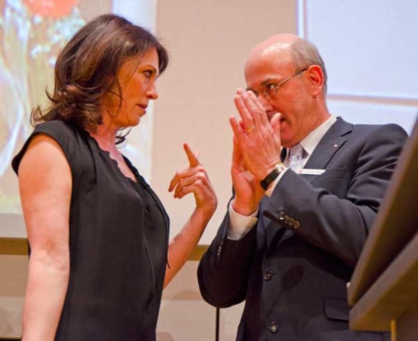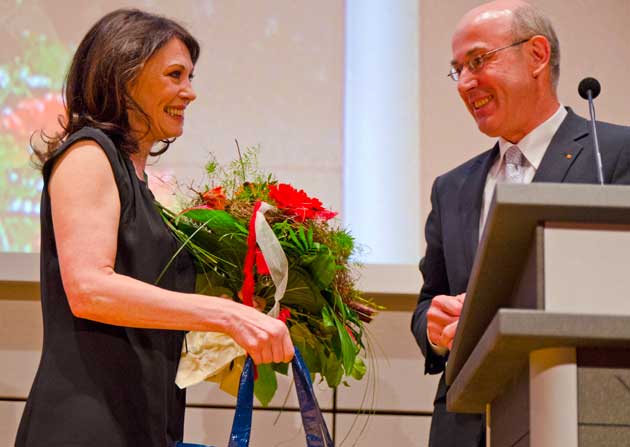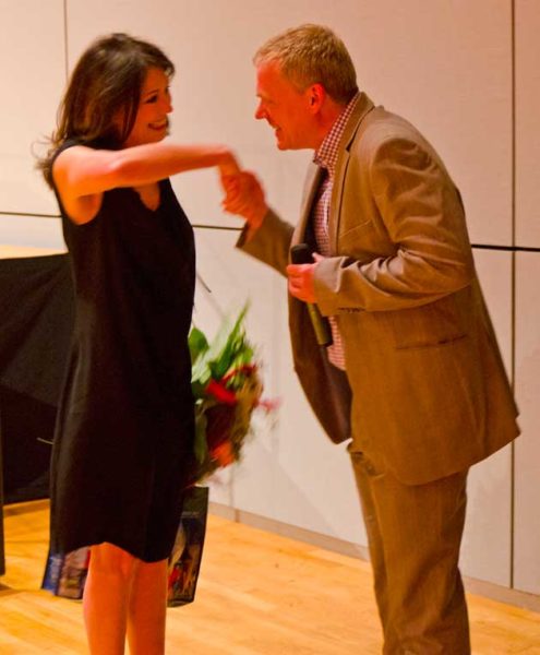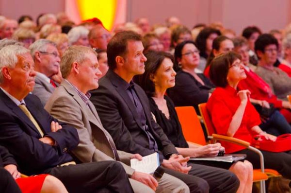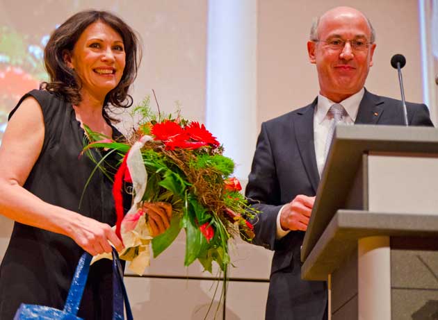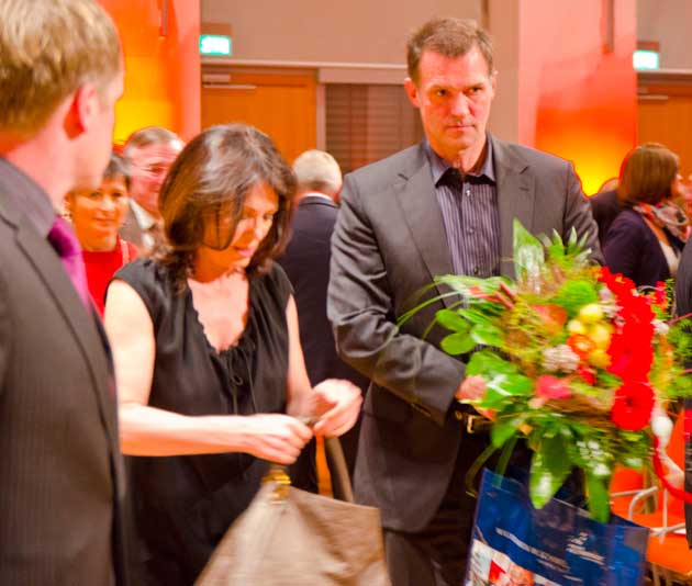 Nach Schweinfurt ist sie mit ihrem Lebensgefährten Heiko Kiesow angereist. Ein üppiger Blumenstrauß, zusammen mit einem Infopaket über die Stadt, war in Verbindung mit dem lang anhaltenden Beifall das Gastgeschenk für diese eindrucksvolle Frau. Die Sparkasse hat mit Iris Berben wieder mal einen Glücksgriff getan.