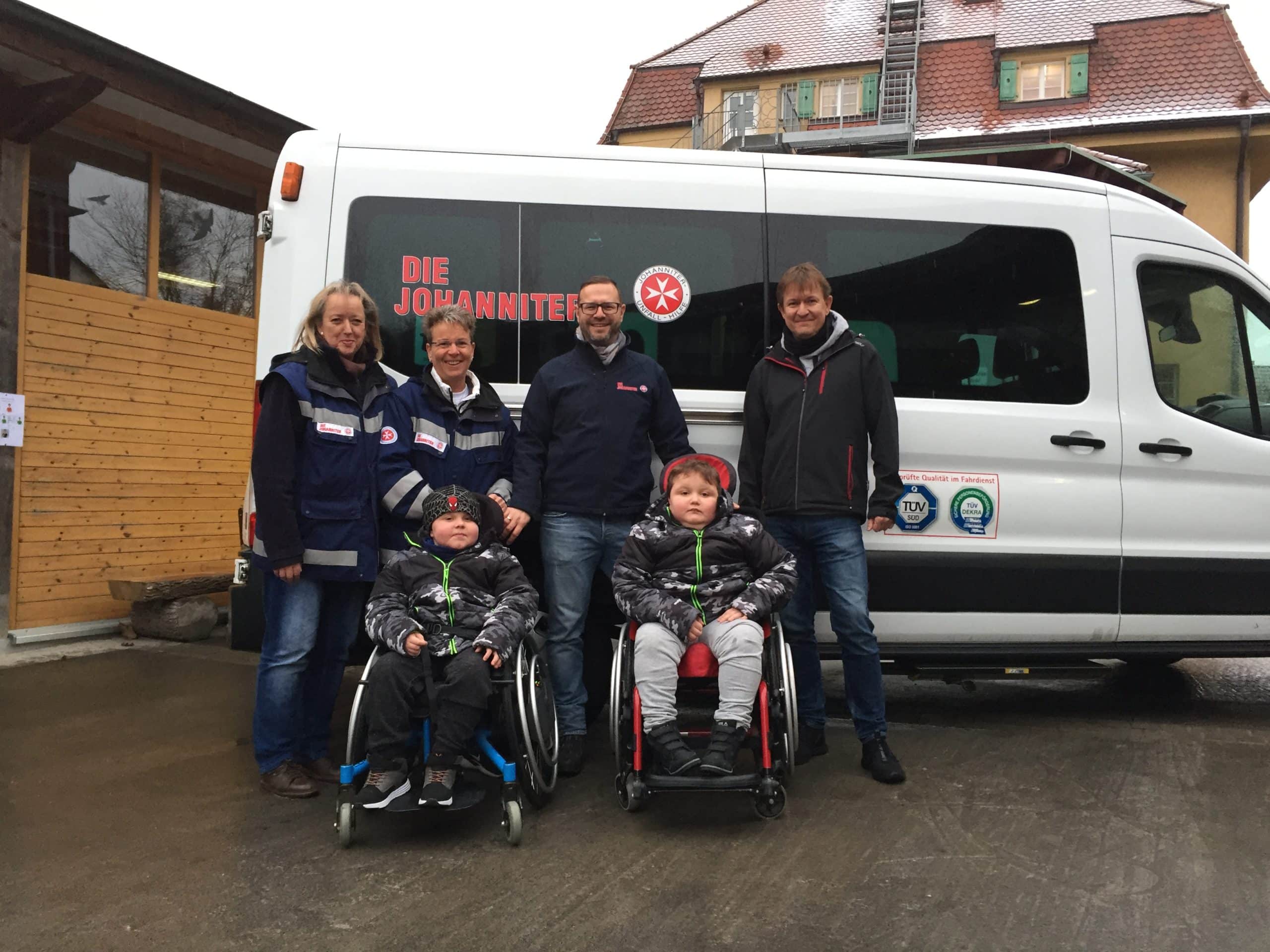 Bildunterschrift v.l.n.r.: Gabriele Kayser und Susanne Guhr (Fahrerinnen; Johanniter Schweinfurt), Michael Koch (Leiter Fahrdienste; Johanniter Schweinfurt) und Thomas Kötzel (Schulleiter; Lebenshilfe Schweinfurt, Förderzentrum Schonungen) mit den Schülern Leon und Dominik. (Uwe Müller/Johanniter)
