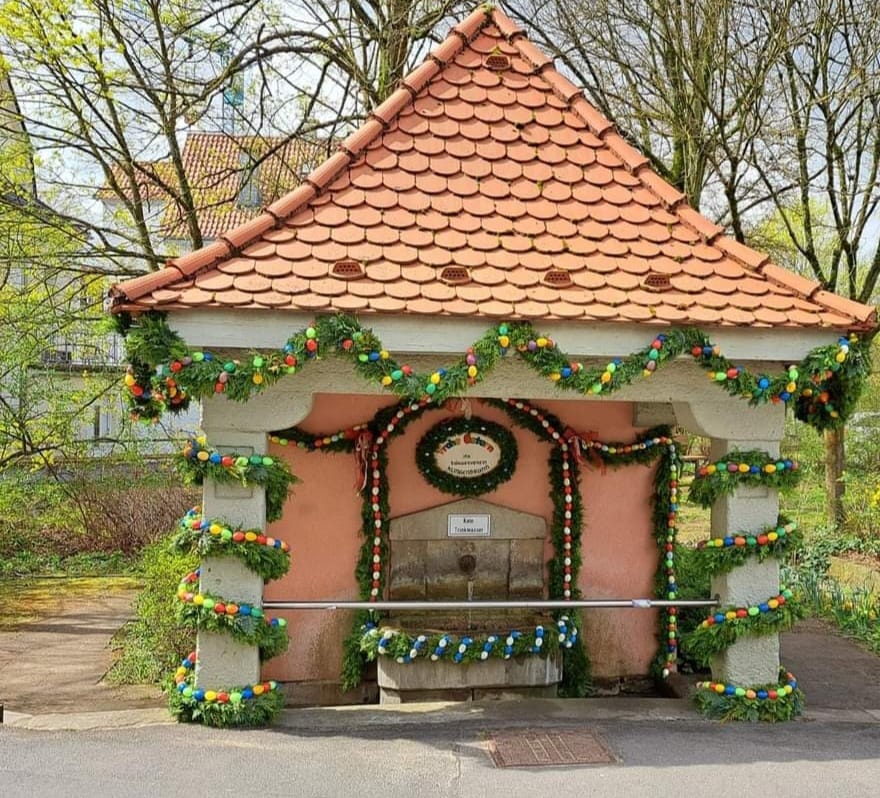 Das Foto (Nina Geitz) zeigt den frisch geschmückten Brunnen.