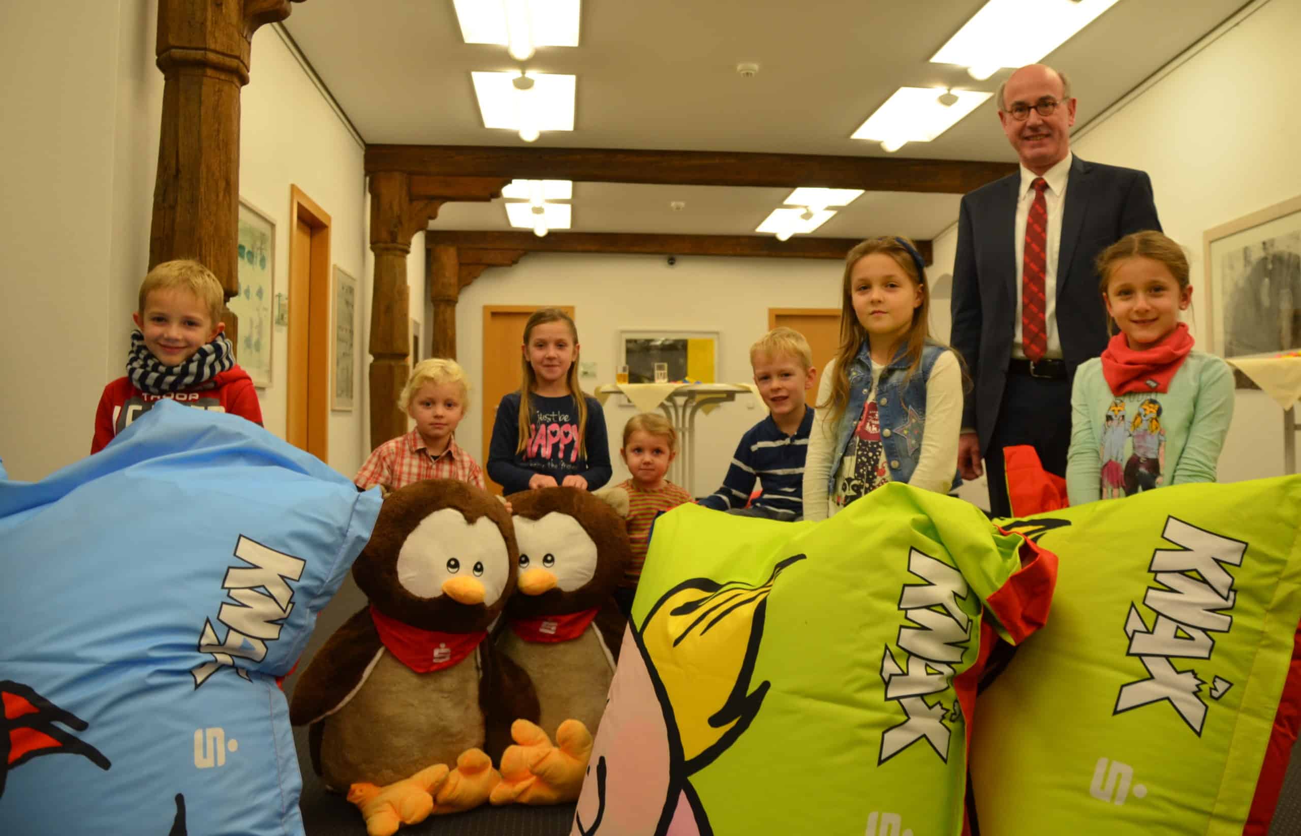 Auch dieses Jahr gab es während der Jugendsparwoche in der Sparkasse Schweinfurt ein Gewinnspiel für die kleinen Sparer. Über 2.000 Kinder kreuzten die richtige Lösung an und nahmen an der Verlosung teil. Die Hauptgewinne – je ein KNAX-Sitzsack – gingen an Lea Marie Memmel aus Üchtelhausen, Lorena Esch aus Niederwerrn, Louis Schulz aus Gochsheim und Niklas Weck aus Bergrheinfeld. Schon während der Preisübergabe in der Sparkassengalerie wurden die Sitzsäcke ausprobiert und für sehr bequem befunden.