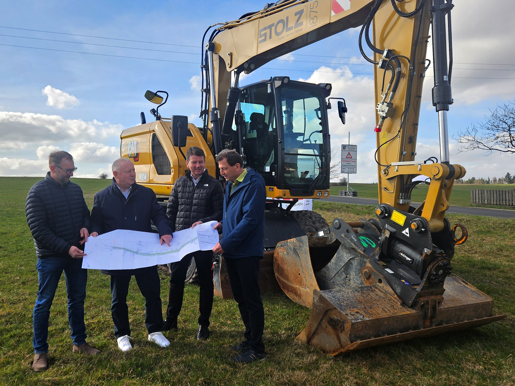 Beim Baustart der KG 31 (von links): Volker Roth (2. Bürgermeister Markt Zeitlofs), Landrat Thomas Bold, Innenstaatssekretär Sandro Kirchner und Bernhard Stolz (Bauunternehmen Stolz).