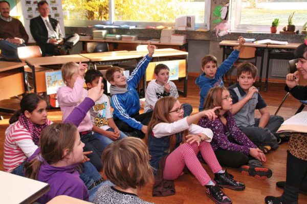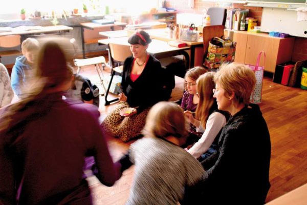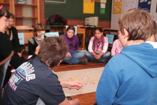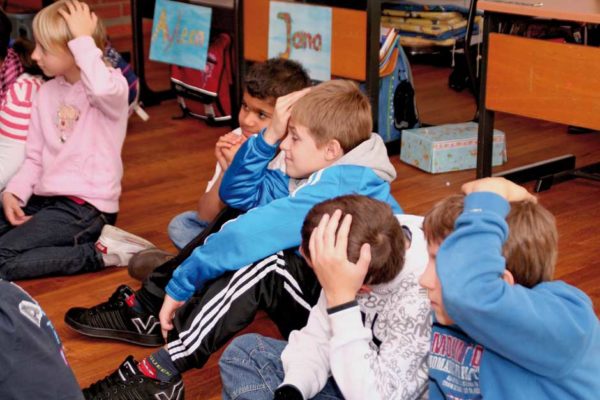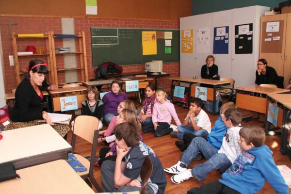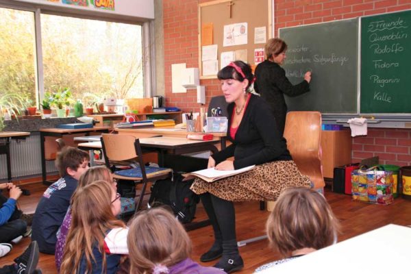Den Kindern ist das alles relativ egal. Sie sitzen am Boden und lauschen der Geschichte von Julia Gock. Dabei unterstützen sie sie kräftig durch Mimik und Gestik. In einer kleinen Fantasiereise schließen sie die Augen und stellen sich ihr Fantasietier vor. Es ist Deutschunterricht, Hörschulung und Sprachgebrauch stehen im Lehrplan des Tages. Das mit dem Hören ist kein Problem, wie gebannt hängen die Kinder an den Lippen der Erzählerin. Und bei einer wörtlichen Rede wird immer die Hand auf den Kopf gelegt. Dann werden „Wie-Wörter“ gesucht. Wie soll das Fantasiewesen sein? Alt oder jung, schwach oder kräftig, groß oder klein?
