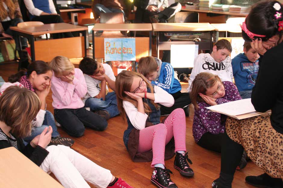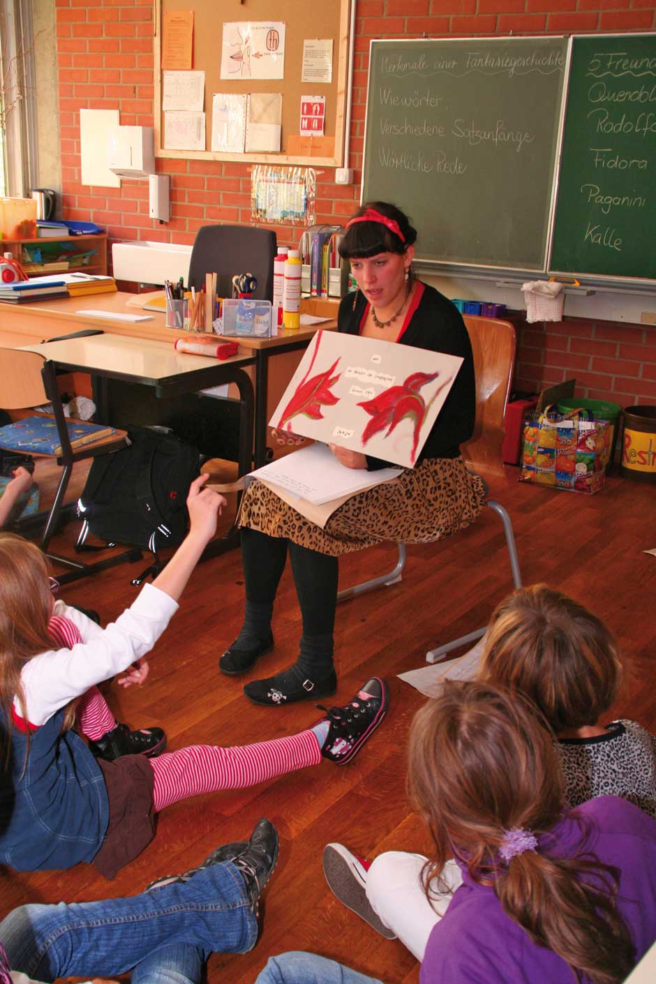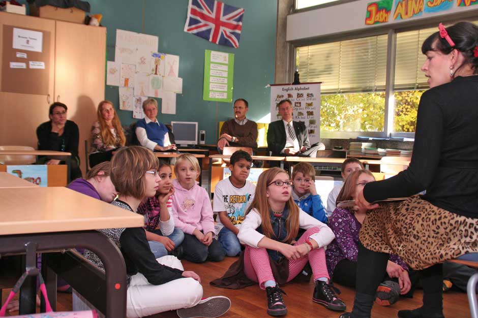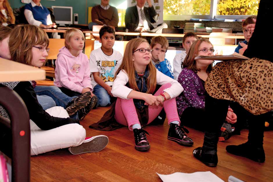 Den Kindern ist das alles relativ egal. Sie sitzen am Boden und lauschen der Geschichte von Julia Gock. Dabei unterstützen sie sie kräftig durch Mimik und Gestik. In einer kleinen Fantasiereise schließen sie die Augen und stellen sich ihr Fantasietier vor. Es ist Deutschunterricht, Hörschulung und Sprachgebrauch stehen im Lehrplan des Tages. Das mit dem Hören ist kein Problem, wie gebannt hängen die Kinder an den Lippen der Erzählerin. Und bei einer wörtlichen Rede wird immer die Hand auf den Kopf gelegt. Dann werden „Wie-Wörter“ gesucht. Wie soll das Fantasiewesen sein? Alt oder jung, schwach oder kräftig, groß oder klein?