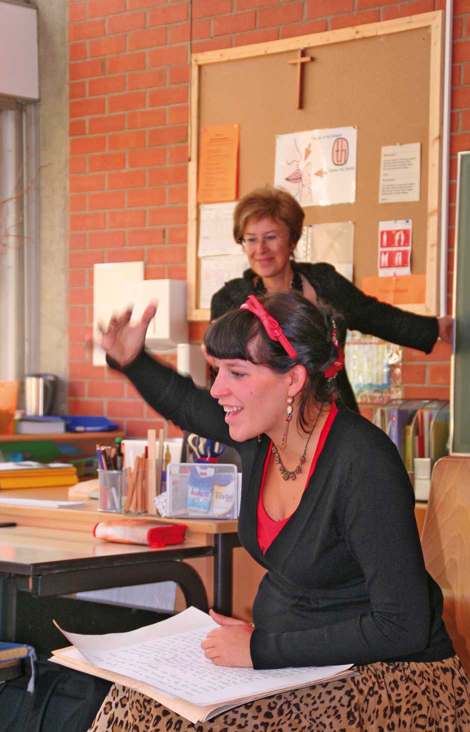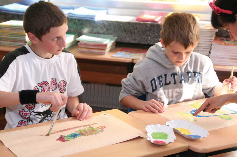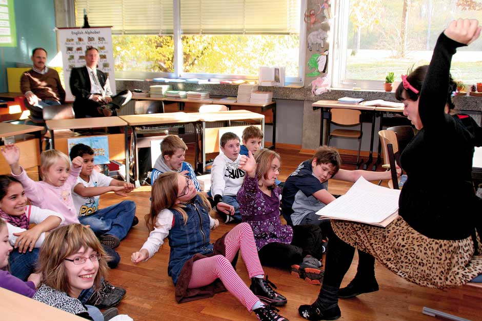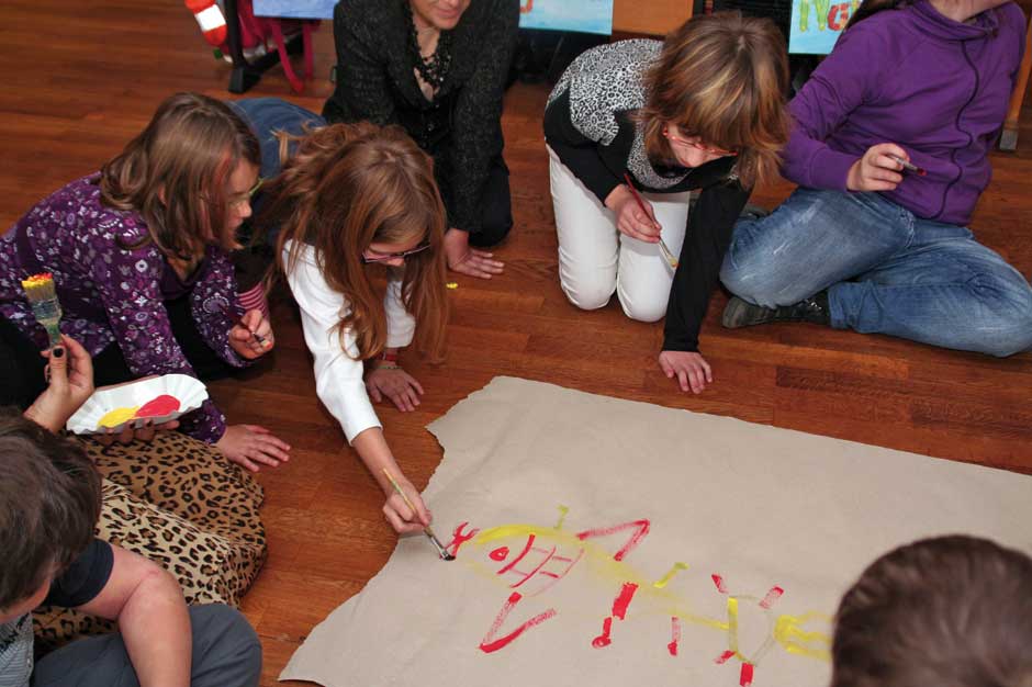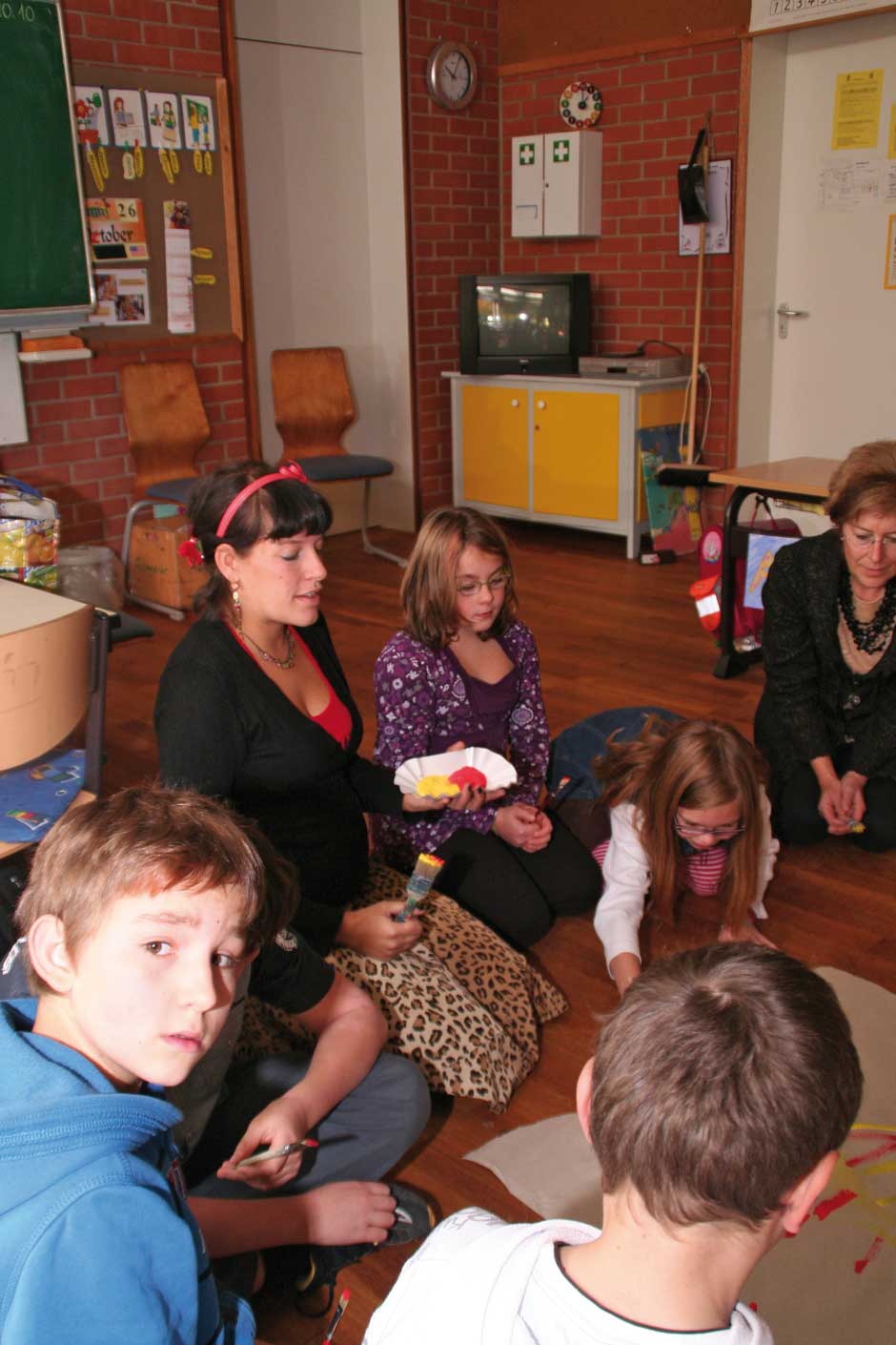 Den Kindern ist das alles relativ egal. Sie sitzen am Boden und lauschen der Geschichte von Julia Gock. Dabei unterstützen sie sie kräftig durch Mimik und Gestik. In einer kleinen Fantasiereise schließen sie die Augen und stellen sich ihr Fantasietier vor. Es ist Deutschunterricht, Hörschulung und Sprachgebrauch stehen im Lehrplan des Tages. Das mit dem Hören ist kein Problem, wie gebannt hängen die Kinder an den Lippen der Erzählerin. Und bei einer wörtlichen Rede wird immer die Hand auf den Kopf gelegt. Dann werden „Wie-Wörter“ gesucht. Wie soll das Fantasiewesen sein? Alt oder jung, schwach oder kräftig, groß oder klein?