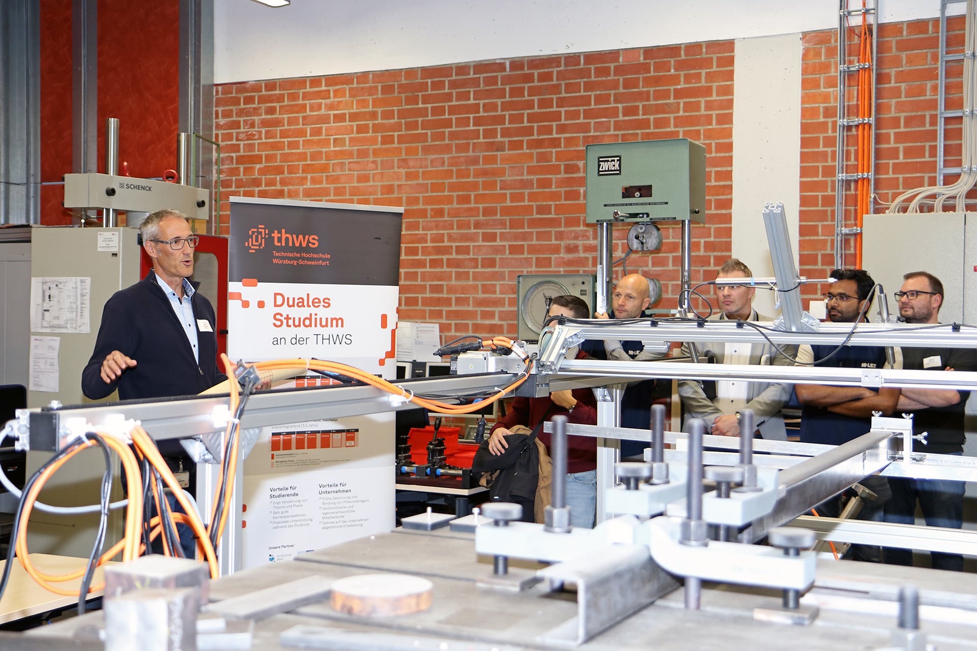 Titelbild: Prof. Dr. Ralf Christel (li.), zuständig für das duale Studium an der THWS, erläutert die Vorteile dieser Studienart beim Gang durch die Labore der Fakultät Maschinenbau (Foto: THWS/Eva Kaupp)
