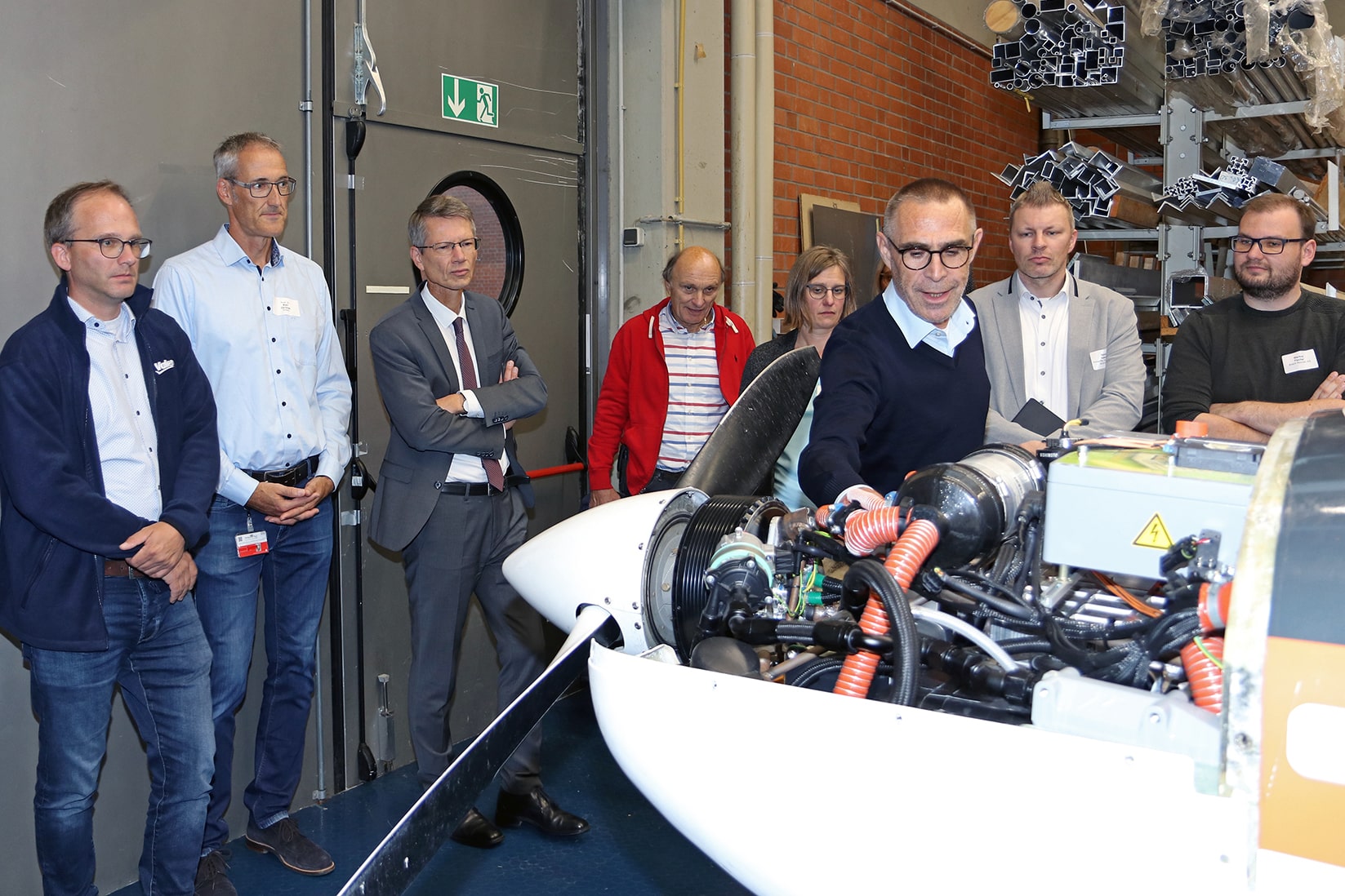 Der Dekan der Fakultät Maschinenbau, Prof. Dr. Johannes Paulus (3. v. re.), erläutert die Fortschritte beim THWS-eigenen Wasserstoffflugzeug für die Firmenvertreter und den Schweinfurter Oberbürgermeister Sebastian Remelé (3. v. li.) (Foto: THWS/Eva Kaupp)