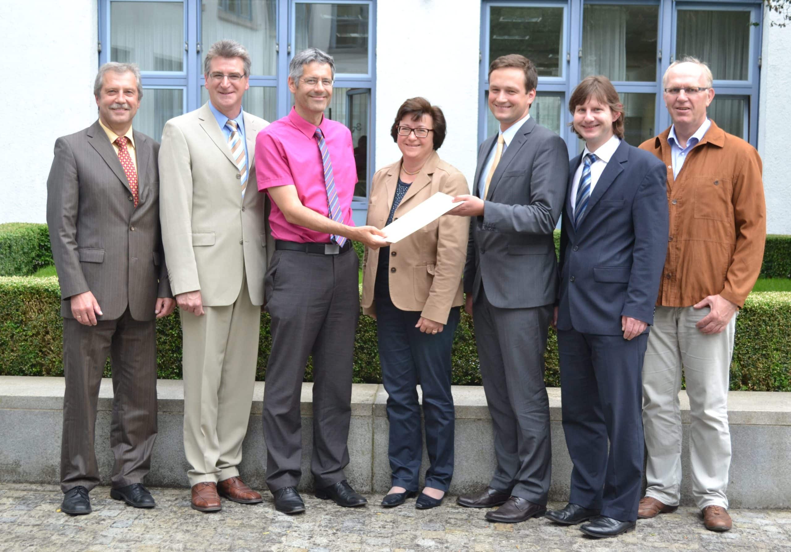 Bild (Foto: Landratsamt Schweinfurt). Ministerialrätin Christine Herrgott (Bayerisches Wirtschaftsministerium) übergab an Landrat Florian Töpper den Förderbescheid über die Fortführung des Regionalmanagements. Auf dem Foto von links: Konrad Bonengel (Sachgebietsleiter Kreisentwicklung, Regionalmanagement), Ulfert Frey (Regionalmanagement), Regierungsdirektor Oliver Weidlich von der Regierung von Unterfranken, Sachgebietsleiter Raumordnung, Landes- und Regionalplanung, Ministerialrätin Christine Herrgott, Landrat Florian Töpper, Holger Becker (Regionalmanagement) und Leader-Manager Wolfgang Fuchs.