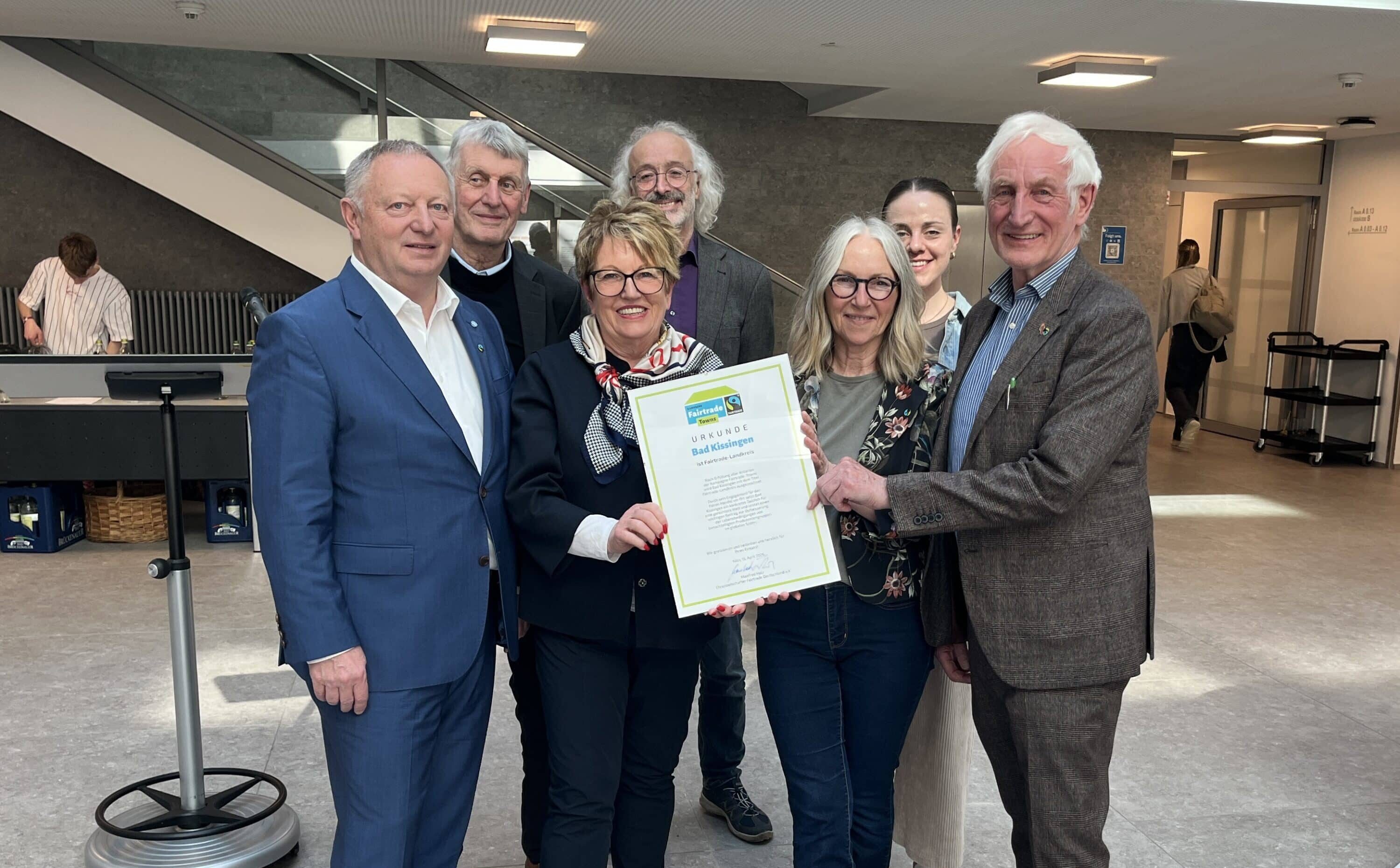 Bild: Landrat Thomas Bold (von links) nahm stellvertretend für den gesamten Landkreis die Urkunde entgegen. Mit dabei waren Jürgen Pfister (stv. Bürgermeister Bad Brückenau; Kreisrat; Mitglied Fairtrade-Steuerungsgruppe), Leiterin der Steuerungsgruppe, Brigitte Meyerdierks, Dirk Hönerlage (Vorstand Eine-Welt-Laden Bad Brückenau), Anja Vorndran (Ansprechpartnerin Fairtrade für die Kommunen) Klimaschutzmanagerin Leonie Hassenjürgen sowie Fairtrade Ehrenbotschafter Eberhard Holz. Foto: Landkreis Bad Kissingen/Lena Metz
