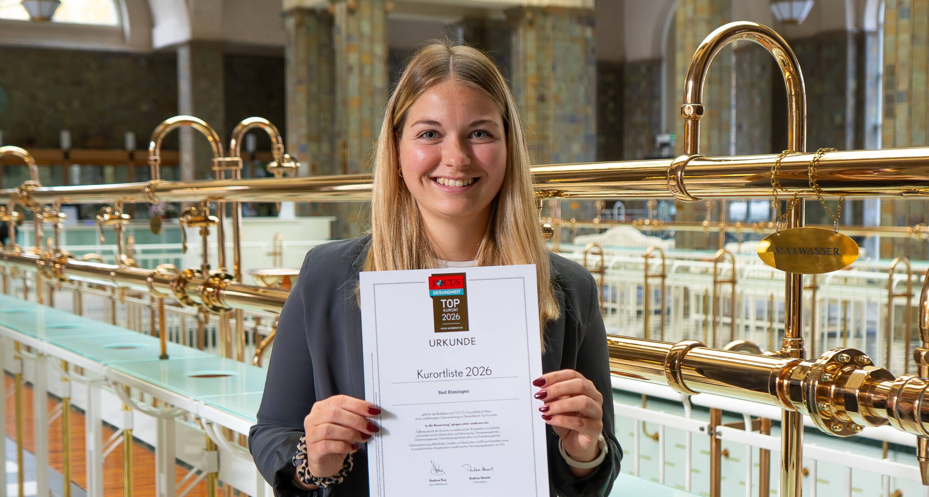Titelbild TOP Kurort 2026 (c) Bayer Staatsbad Bad Kissingen GmbH_Foto Nina Pereira Santo: Gesundheitslotsin der Staatsbad Bad Kissingen GmbH Antonia Wald freut sich über die Auszeichnung zum Top Kurort 2026 durch das Magazin Focus-Gesundheit.
