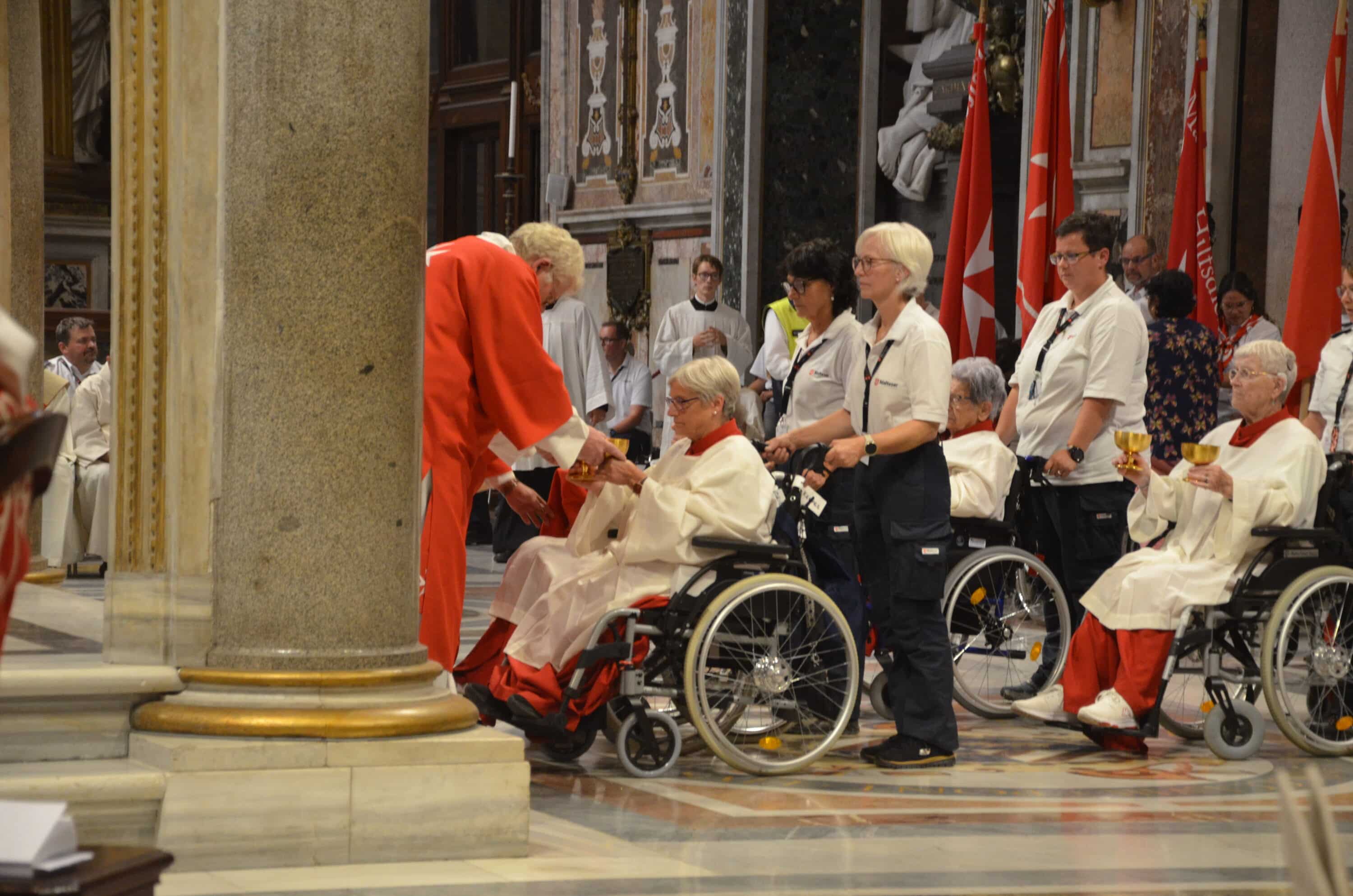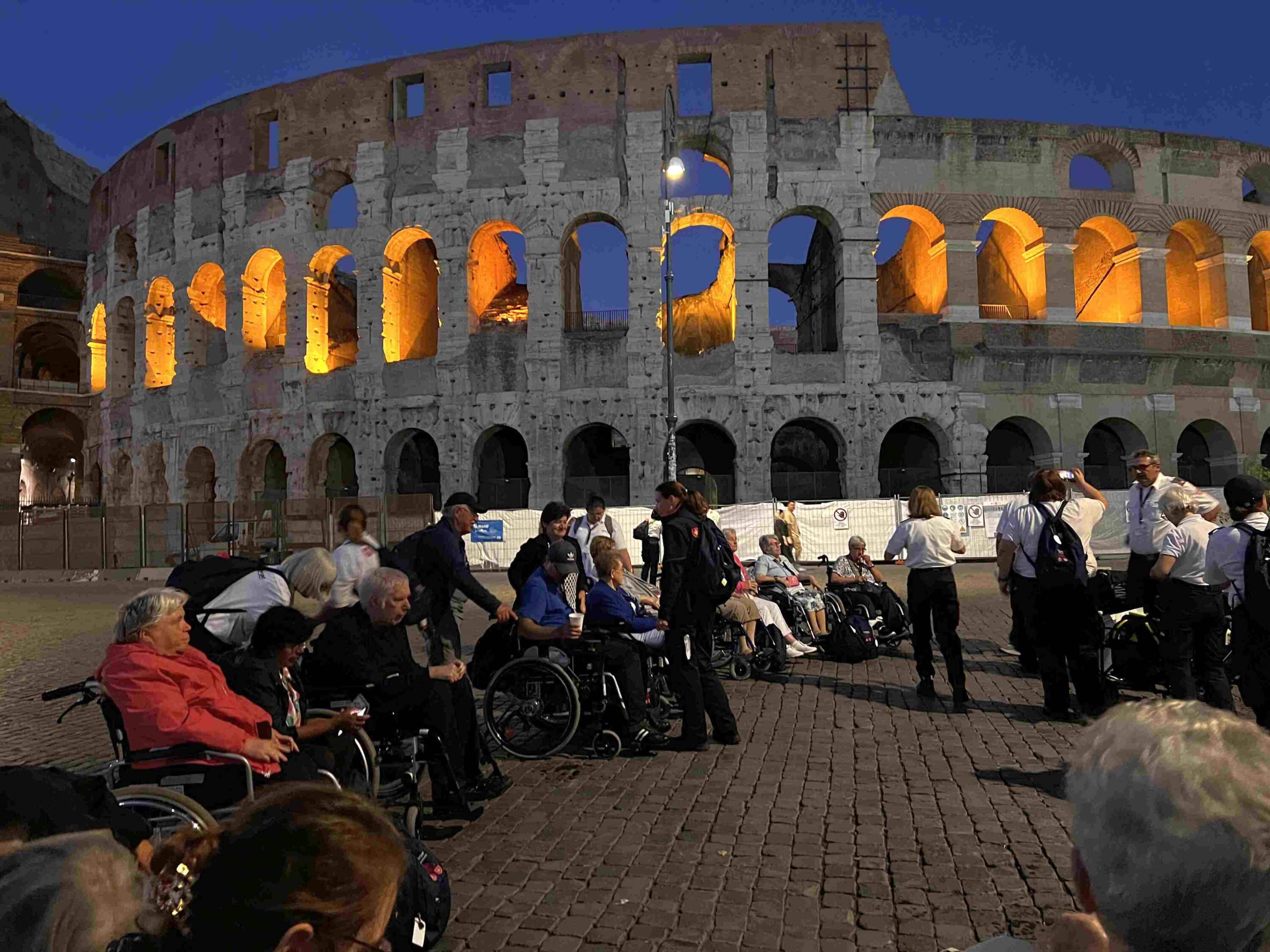 Würzburg/Unterfranken. „Das ist gar nicht in Worte zu fassen, was ich in dieser Woche alles mit Euch erlebt habe“, so eine Würzburger Teilnehmerin der Malteser Wallfahrt für Menschen mit Behinderung, die Anfang Oktober 700 Pilgerinnen und Pilger aus ganz Deutschland nach Rom führte. Aus Unterfranken war ein Reisebus mit besonderer Hebebühne dabei, in dem sich ein Team aus 16 ehrenamtlichen Maltesern um die 20 Teilnehmenden aus der ganzen Diözese Würzburg gekümmert hat. Ziel des Malteserteams aus Rettungs- und Pflegekräften, einem Arzt und einer Seelsorgerin war es, den Teilnehmenden eine wunderbare und unbeschwerte Woche zu schenken. „Die Wallfahrt ist eine ganz eigene Mischung aus zutiefst spirituellen Erlebnissen und touristischen Aspekten, die unsere Teilnehmenden sonst so nicht schaffen würden“, so Busleiterin Christina Gold von den Würzburger Maltesern. Bei den drei Gottesdiensten in den größten römischen Kirchen St. Peter, St. Paul vor den Mauern und Lateransbasilika war die Beteiligung aller erwünscht: Auch die Rollstuhlfahrerinnen und -fahrer durften wie selbstverständlich ministrieren, die Lesung lesen oder das Malteserbanner tragen – eine besondere Ehre und Gelegenheit, trotz ihrer Behinderung (wieder oder erstmalig) eine Aufgabe im Gottesdienst zu übernehmen. Daneben standen natürlich Erkundungen der Ewigen Stadt auf dem Programm. Die Besichtigung des Colosseums oder ein Vormittag am Strand von Ostia sind da nur zwei kleine Beispiele. „Manch einer hatte noch nie mit bloßen Füßen im Sand oder gar im Meer gestanden“, erzählt Gold noch immer berührt von den besonderen Momenten der Reise. Mit vereinten Kräften machten es die ehrenamtlichen Malteser möglich, dass solche Wünsche wahr werden. „Das Strahlen in den Augen unserer Teilnehmenden ist alle Anstrengungen wert“, so Christina Gold, die seit 2003 an der im Schnitt alle drei Jahre stattfindenden Wallfahrt dabei ist.