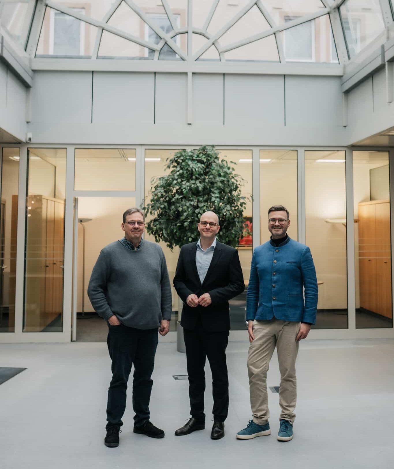 Foto: Die ehemalige Commerzbank-Filiale am Marktplatz 1 wird zur „Markthalle Bad Kissingen“. Oberbürgermeister Dr. Dirk Vogel (Mitte) und Wirtschaftsförderer Sebastian M. Bünner (rechts) präsentierten die Pläne. Die Werbegemeinschaft Pro Bad Kissingen mit 2. Vorsitzendem Ralf Strauch (links) unterstützt das Projekt.