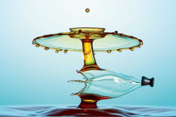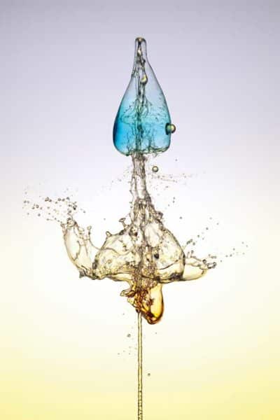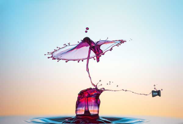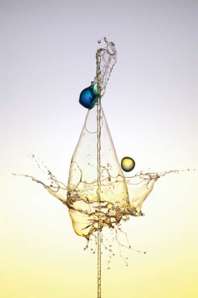 Wie jeder, der mit der Tropfenfotografie angefangen hat, versuchte sich Markus an manuellen Tricks, Wasser aus einem Becher in ein Gefäß tropfen lassen und versuchen das Ereignis mit der Kamera festzuhalten. Es entstanden Zufallsprodukte, die den Techniker nicht zufriedengestellt haben. Es muss auch besser gehen. Markus besorgte sich aus der Apotheke ein Infusionsset, das ist eine Regulierung am Schlauch, mit der man die Tropfengeschwindigkeit einstellen kann. Bei einer Geschwindigkeit von ca. 10 Tropfen in der Sekunde stellten sich die ersten Erfolge ein. Jetzt konnte er je nach Variationen von Höhe und Geschwindigkeit schon recht tolle Tropfenformen erzeugen.