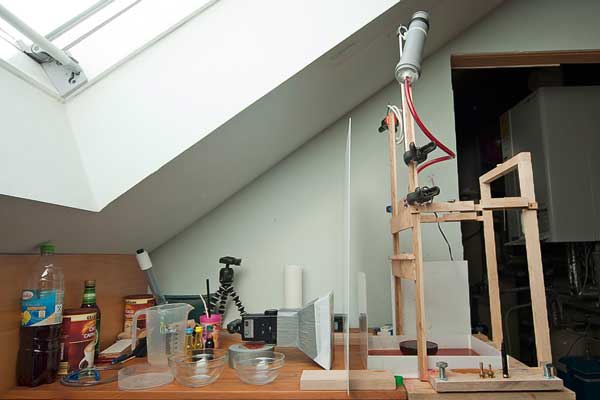Heute arbeitet er mit raffiniert ausgeklügelten elektrischen Schaltungen, mit Lichtschranken und Magnetventilen, meistens Marke Eigenbau. Er hat sich ein langes Wasserbecken selbst gebaut, um Spiegelungen aus dem Hintergrund zu vermeiden. Acrylglasscheiben mit dahinter montieren Blitzgeräten bilden seine Beleuchtung.