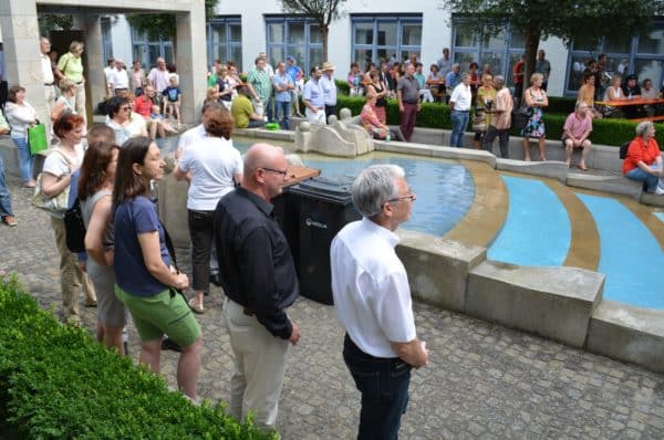 4) Die Besucher lauschen im Innenhof dem ersten öffentlichen Auftritt des Amtschors.