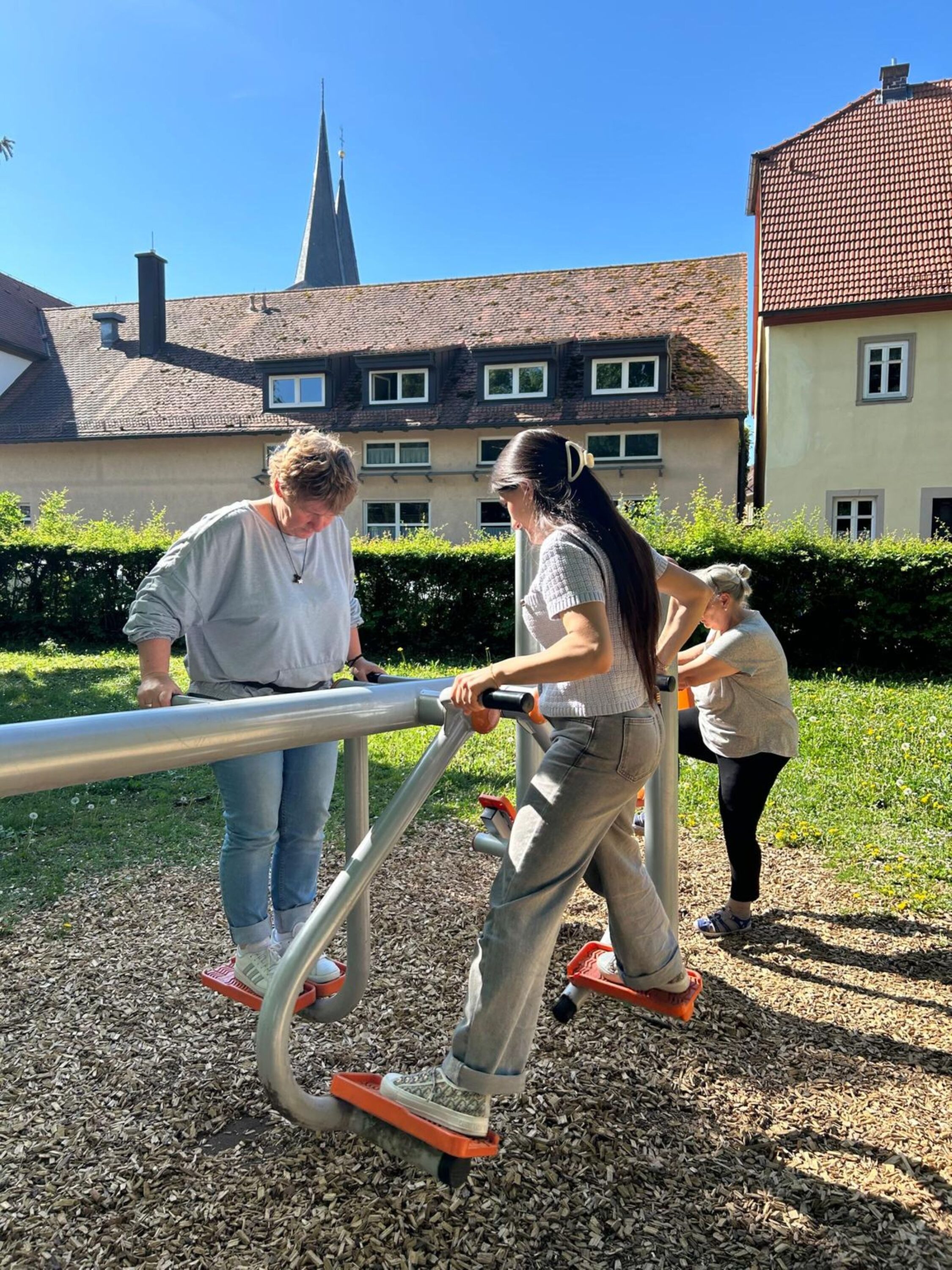 Damit das Angebot auch bei schlechter Witterung kontinuierlich stattfinden kann, besteht seit über einem Jahr eine Kooperation mit dem Stadtlabor der Smart Green City Haßfurt. In den Räumlichkeiten des Stadtlabors werden digitale Angebote genutzt, um gemeinsame Workouts durchzuführen – beispielsweise Übungen im Sitzen mit dem Theraband, Einheiten im Stehen zur Förderung von Gleichgewicht und Balance sowie gemeinsames Dehnen und Strecken. So kann „MIT & FIT“ wetterunabhängig fortgeführt werden und verbindet analoge Bewegung mit modernen technischen Möglichkeiten.