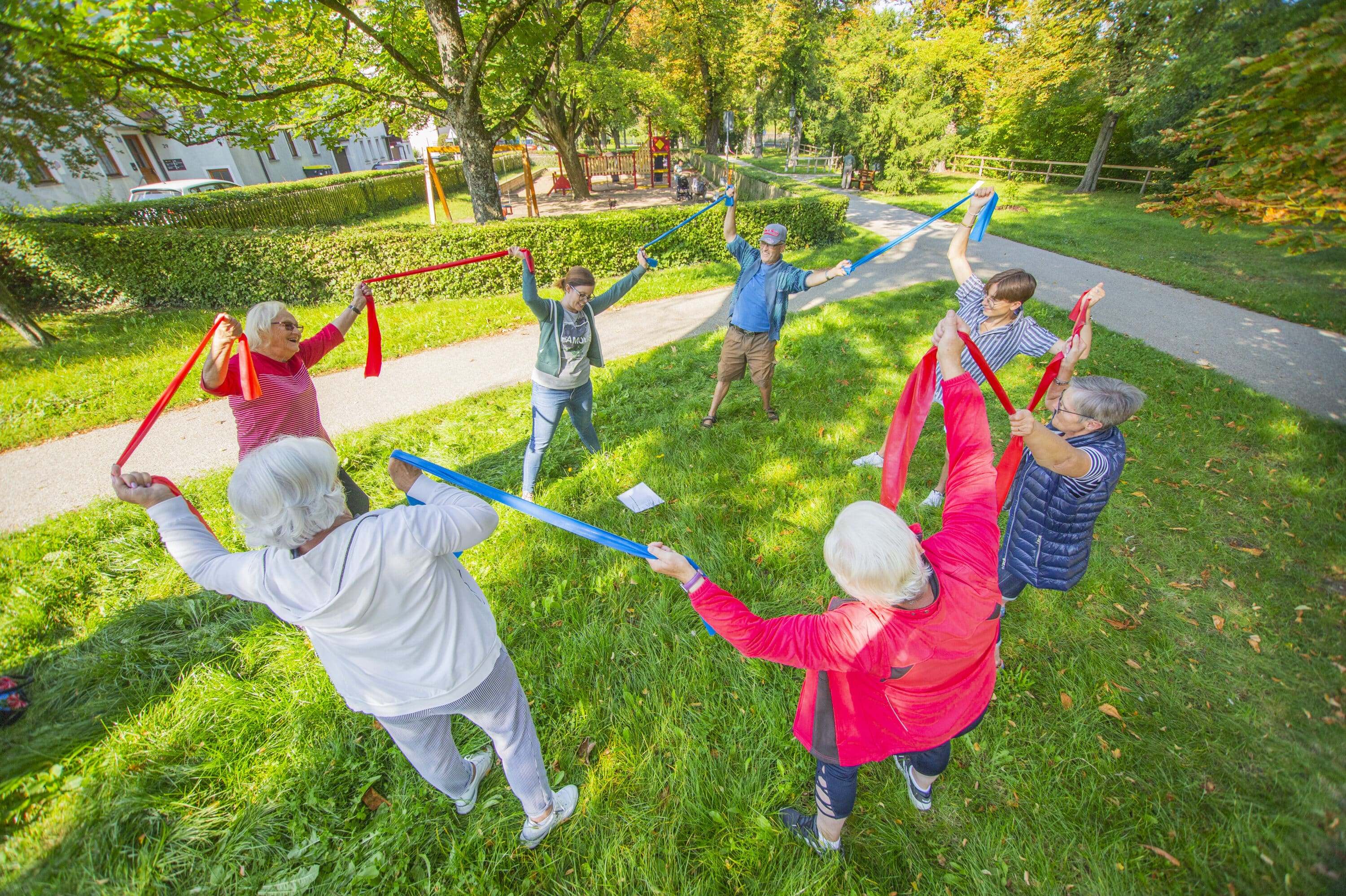 Bild 2: Gemeinsam stark: Durch gezielte Übungen mit dem Theraband trainierten die Teilnehmenden bei „MIT & FIT – Begegnung durch Bewegung“ mit spielerischen Übungen ihre Mobilität in Armen und Schulten. (Bildquelle: René Ruprecht)