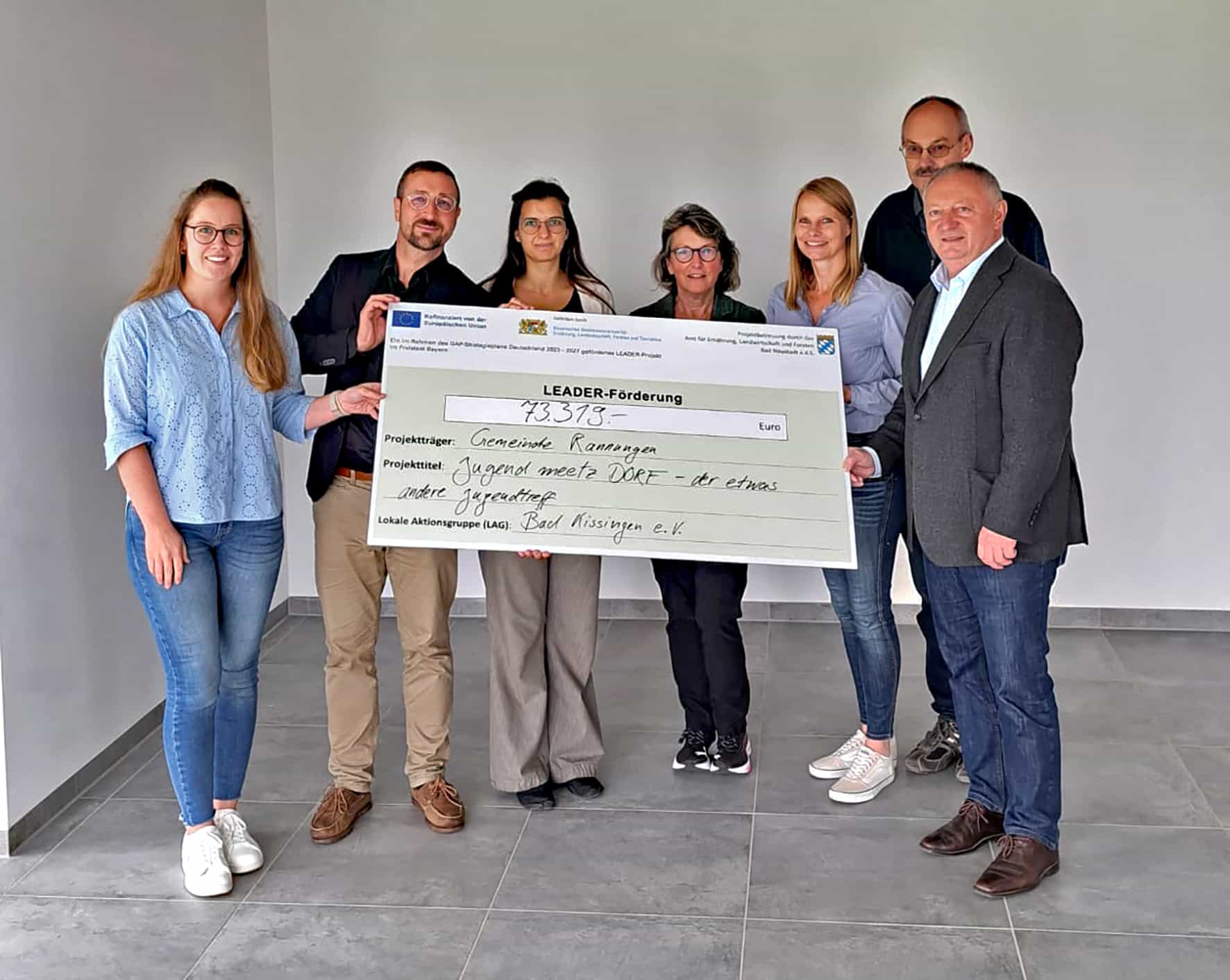 Emma Ferkinghoff (LAG-Management), Daniel Pascal Klaehre (unterfränkischer LEADER-Koordinator), Johanna Waibl (Jugendmanagement Rannungen), Sybille Büttner (2. Bürgermeisterin Rannungen), Bettina Bonengel (3. Bürgermeisterin), Fridolin Zehner (1. Bürgermeister), Landrat Thomas Bold (von links). Foto: Thomas Reißle
