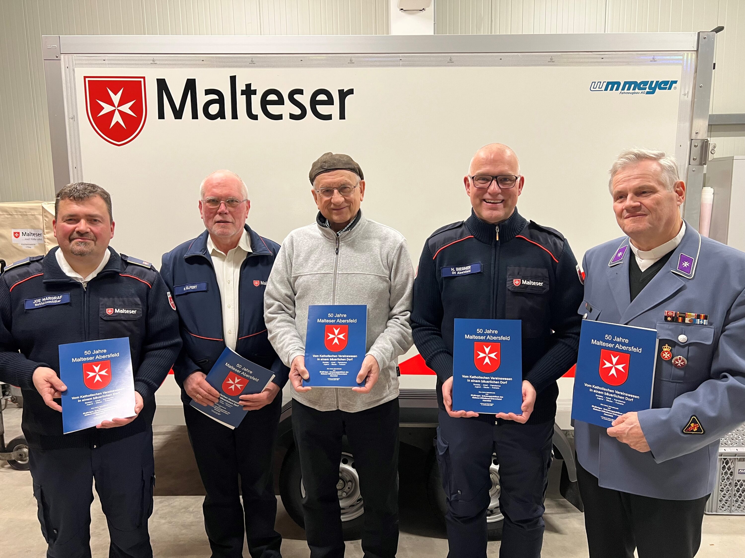 Abersfeld. Beim Neujahrsempfang der Malteser Abersfeld, der in ihrer neuen Unterkunft stattfand, hat der Abersfelder Ortschronist Robert Mantel die umfangreiche Jubiläums Chronik „50 Jahre Malteser Abersfeld“ offiziell an den Ortsbeauftragten Christian Margraf überreicht. Die Chronik dokumentiert nicht nur ein halbes Jahrhundert Malteser Arbeit im Ort, sondern verknüpft diese eng mit der mehr als 125 jährigen Geschichte der kirchlich sozialen Vereine in Abersfeld. Sie erzählt von der Gründung der Abersfelder Malteser 1975 in Waldsachsen bis hin zum heutigen, hochengagierten Verband mit rund 50 aktiven Helferinnen und Helfern und einer bunten Jugendarbeit. Sie beleuchtet die moderne Struktur, die sich in den vergangenen Jahrzehnten etabliert hat, und greift auch das besondere Miteinander mit den Menschen und den anderen Vereinen und Gruppierungen im Ort auf, das den Maltesern so wichtig ist. Ortsbeauftragter Christian Margraf würdigte die Chronik als wunderbares Zeugnis des ehrenamtlichen Malteser-Engagements in Abersfeld und darüber hinaus. Das Lesen habe ihm großen Spaß gemacht, denn selbst er habe noch viel Neues erfahren.“ Margraf und sein Stellvertreter Holger Biegner dankten auch ihrem Vorgänger Norbet Elfert, der viele historischen Dokumente, Zeitungsartikel und Fotos beigetragen hat, und Robert Mantel für das aufwändige Sortieren und Ordnen der vielen Unterlagen: „Es ist toll, was du da an historischer Arbeit geleistet hast. Darauf können wir jetzt gut aufbauen.“
