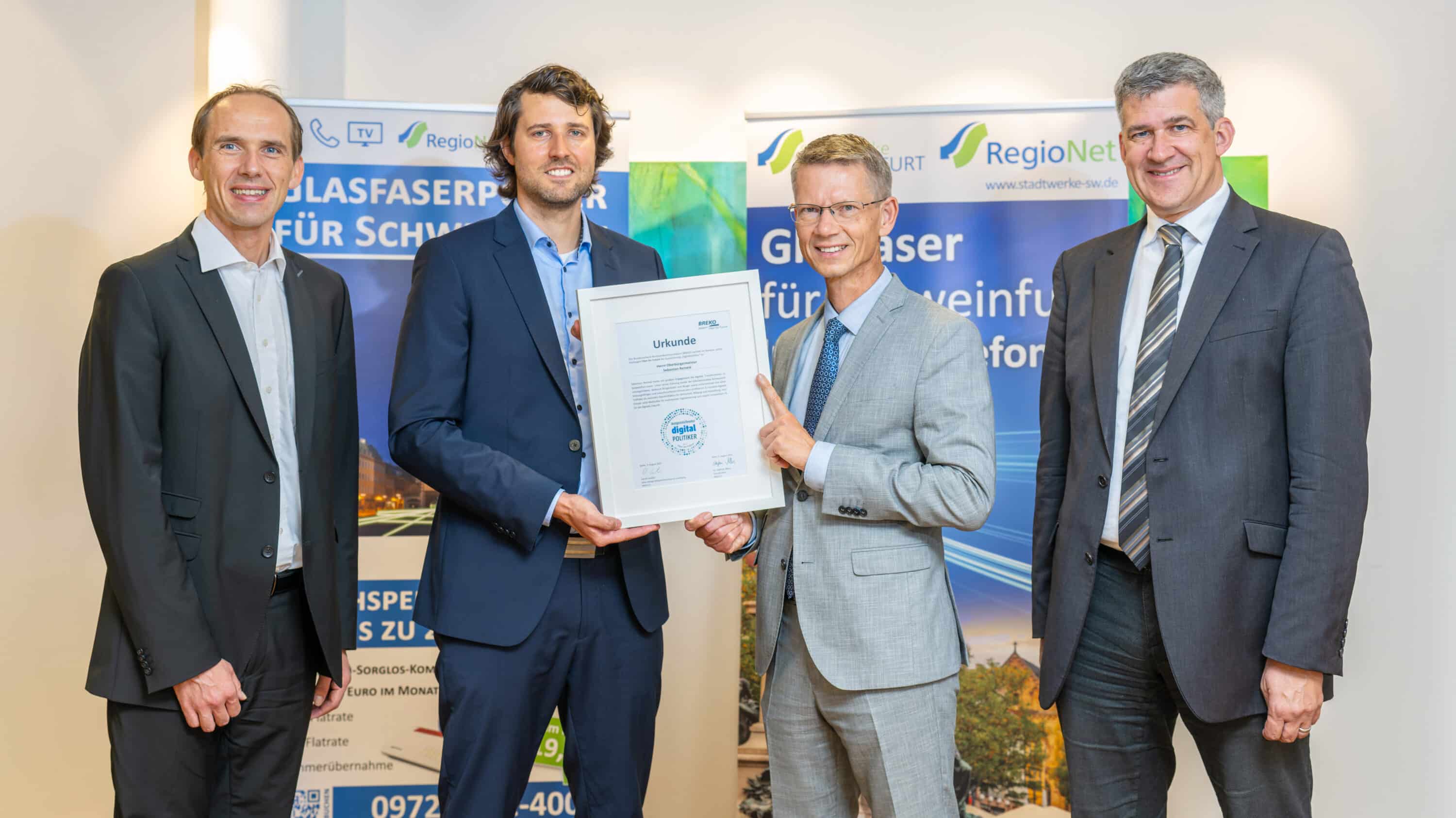 Titelbild: v.l.n.r. Andreas Göb (Bereichsleiter Technik, Stadtwerke Schweinfurt GmbH), Daniel Seufert (Senior Manager, Bundesverband Breitbandkommunikation e.V.), Sebastian Remelé (Oberbürgermeister und Aufsichtsratsvorsitzender, Stadtwerke Schweinfurt GmbH), Thomas Kästner (Geschäftsführer, Stadtwerke Schweinfurt GmbH) Foto: Anand Anders für Stadtwerke Schweinfurt GmbH