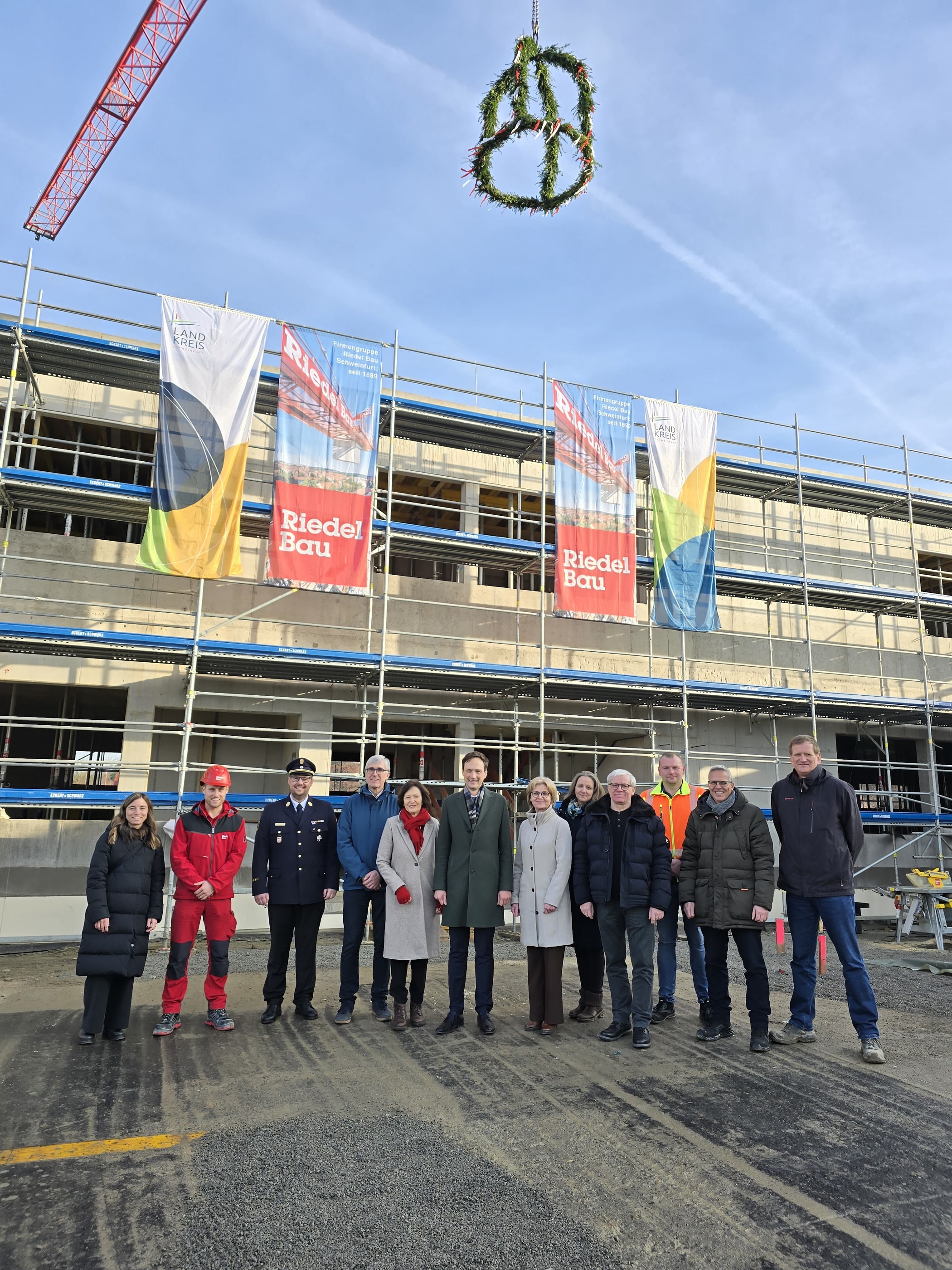 Im Bild, von links: Julia Mack (Projektleitung/Hochbauamt Landratsamt), David Ockel (Polier/Riedel Bau), Kreisbrandrat Alexander Bönig, stellv. Landrat Thomas Vizl, stellv. Landrätin Christine Bender, Landrat Florian Töpper, stellv. Landrätin Bettina Bärmann, Dr. Anja Heinelt (Leitung Veterinäramt/Landratsamt), Lothar Meißner (Geschäftsführender Gesellschafter der FMP design engineering GmbH), Kreisbauhof-Leiter Maurice-Riccardo Schmitt, Frank Hart (Leitung Hochbauamt/Landratsamt) und Christian Ernst (Bauleiter und Betriebsratsvorsitzender/Riedel Bau)